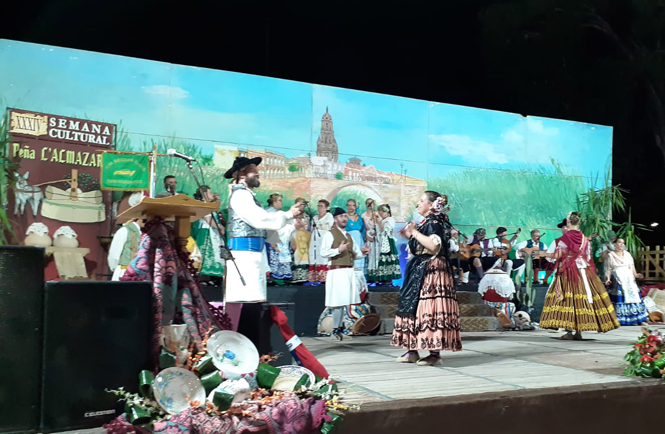 Esta 34ª Semana Cultural de la peña L’Almazara comenzaron el martes 9 de julio con una propuesta de folklore murciano. Ésta contó con la participación del grupo de coros y danzas Antoñete Gálvez de la peña El Ciazo (Torreagüera), y el nombramiento del socio de honor, cargo que este año recae en la familia Olmedo Muñoz. Además, se coronaron a las nuevas madrinas de la peña: Victoria Martínez (mayor), Nuria Sandoval (juvenil) y Helena Garrido (infantil). El broche musical lo pusieron las rancheras de Carlos e Isaac y sus mariachis, y la voz de Carmen Saura.
