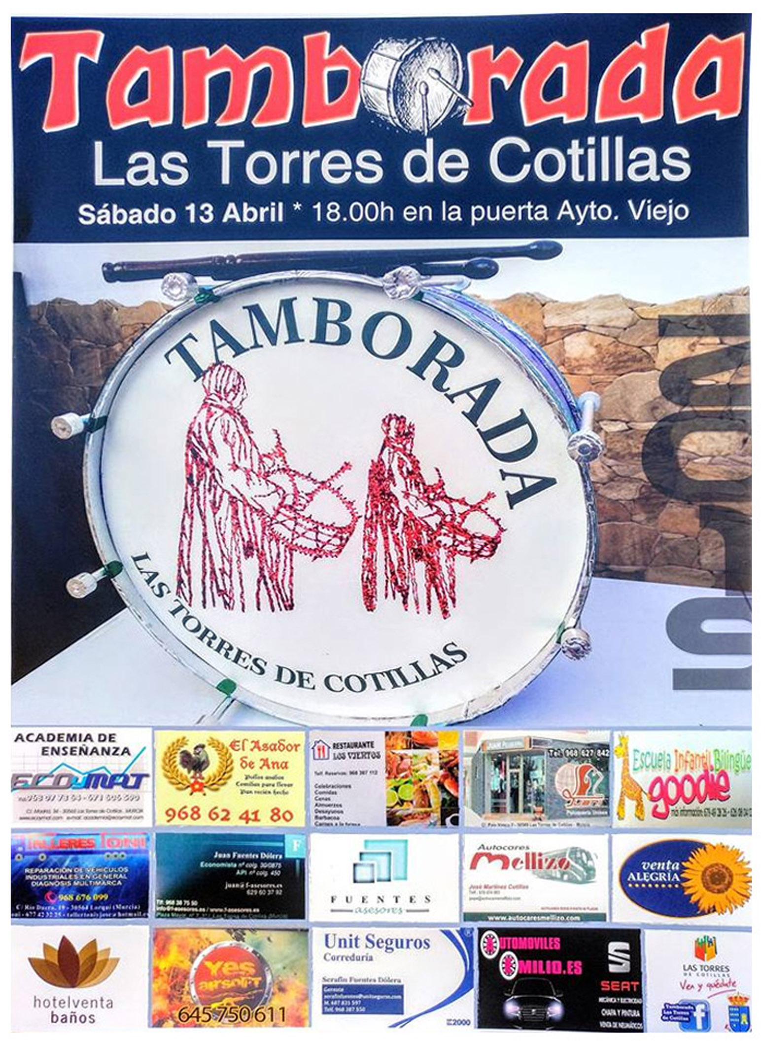 Mañana sábado 13 de abril los tambores volverán a su tradicional cita con Las Torres de Cotillas como aperitivo de la Semana Santa. Será desde las 18 horas con la Tamborada Torreña 2019, que arrancará un año más en la explanada Maestro Don Ángel Palazón del municipio. Allí se irán congregando los participantes con sus atronadores instrumentos para ir calentando motores.