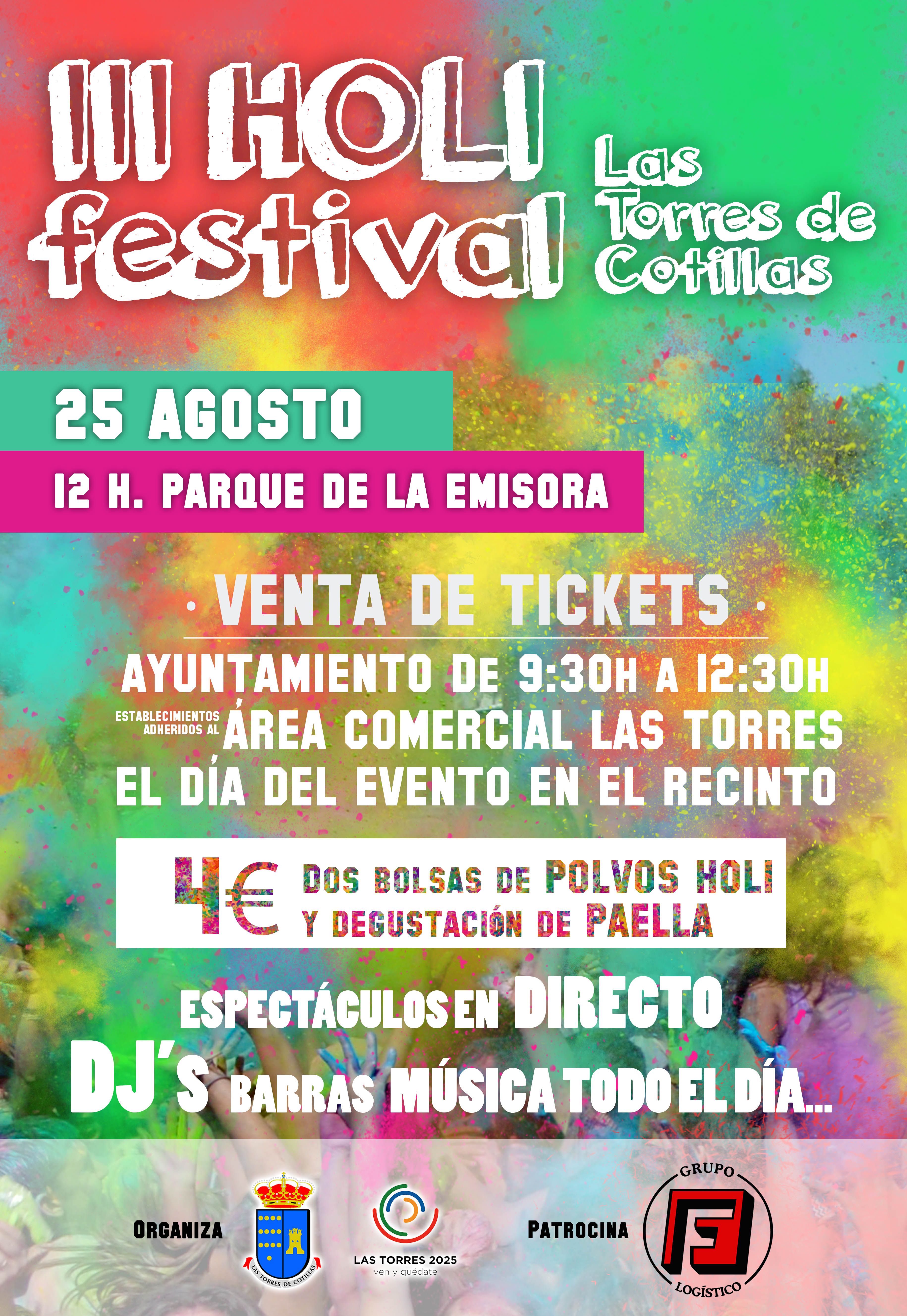 Los tickets de este festival, que está patrocinado por la empresa local ‘Grupo Fuentes’, se pueden adquirir en el Ayuntamiento de 9’30 a 12’30 horas, en los comercios adheridos al ‘Área Comercial Las Torres’ y el día del evento en el propio recinto. “Por el precio de cuatro euros incluyen dos bolsas de polvos holi y una degustación de paella”, especifica Pérez.