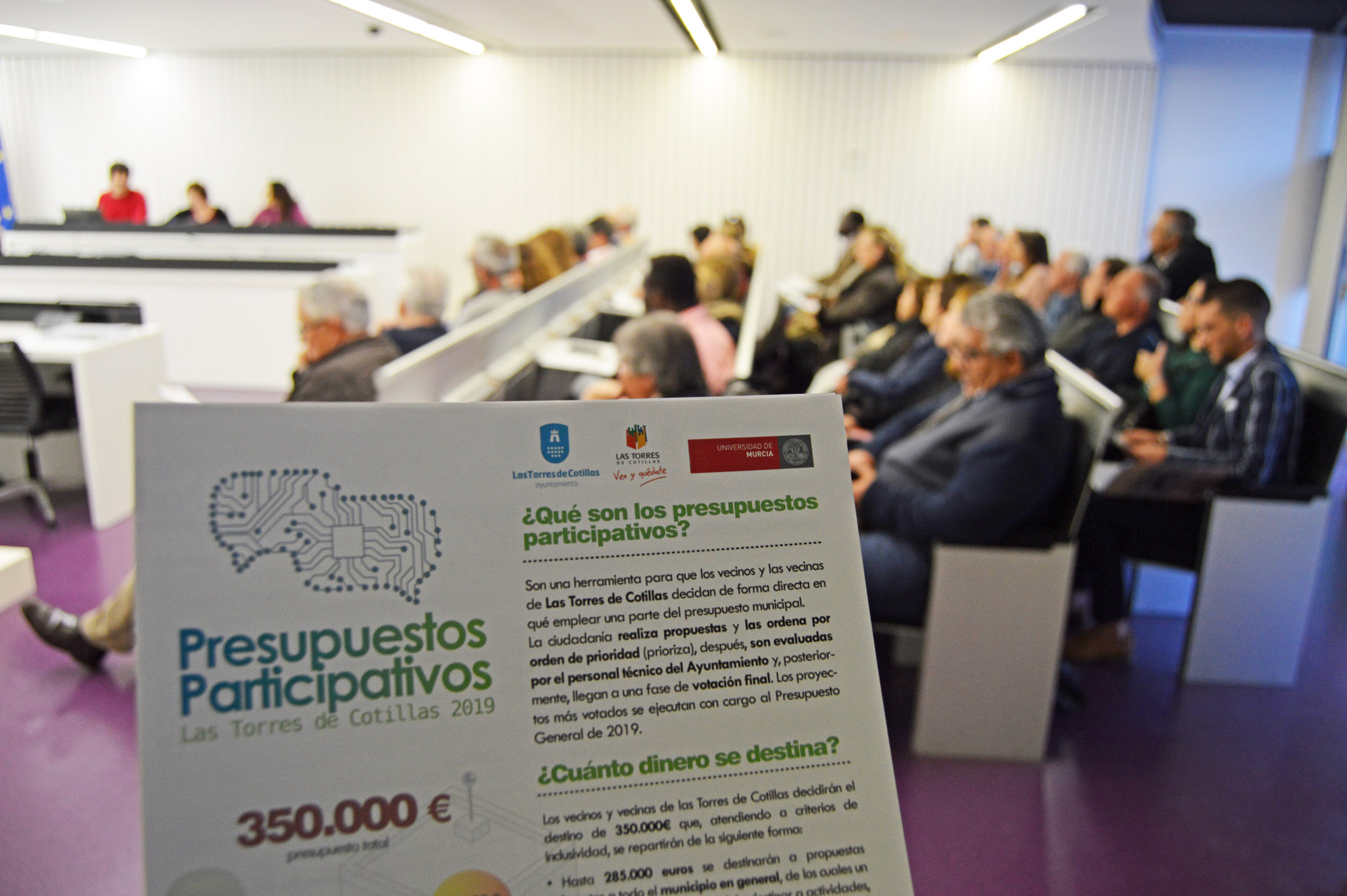 Ya ha comenzado el proceso de presupuestos participativos 2019 de Las Torres de Cotillas, que contarán con 350.000 euros destinados a actividades y/o inversiones financieramente sostenibles. La primera piedra de esta propuesta son las sesiones informativas en el municipio, que arrancaron el pasado jueves 31 de enero con los representantes de las asociaciones de vecinos locales como protagonistas. “Vamos a realizar diferentes encuentros en barrios, pedanías y sectoriales hasta el próximo 12 de febrero, para fijar el 14 de febrero la recogida de propuestas”, señala la alcaldesa, Isabel María Zapata, presente en esta reunión.
