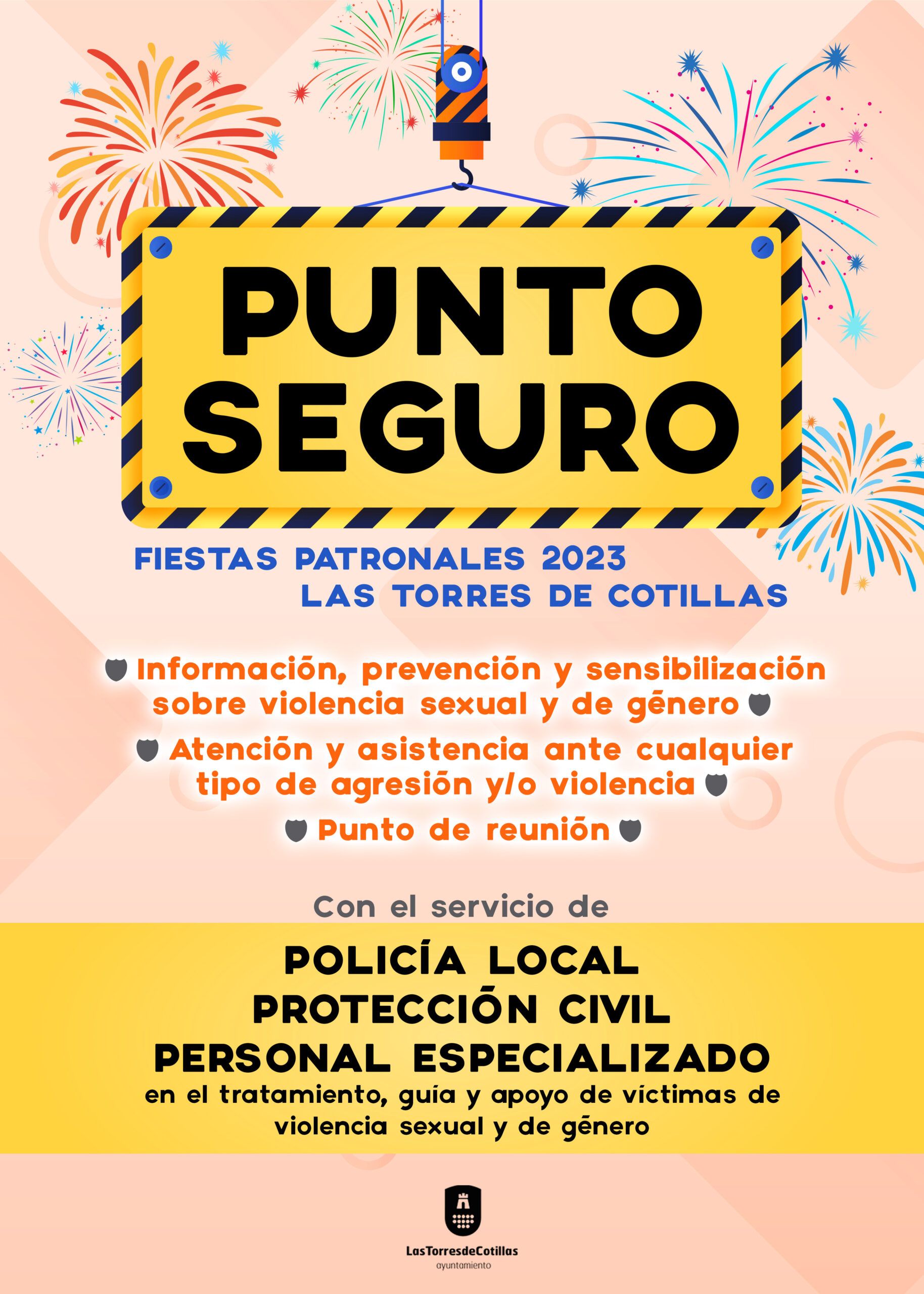 Las fiestas patronales de Las Torres de Cotillas, que se celebran del 18 al 27 de agosto en honor a la Virgen de la Salceda, contarán con un “Punto Seguro”. Será un servicio que estará activo en los eventos multitudinarios previstos en los festejos y que contará con un puesto de atestados con la presencia de Policía Local, con voluntarios de Protección Civil y con personal especializado en el tratamiento, guía y apoyo de víctimas de violencia sexual y de género.