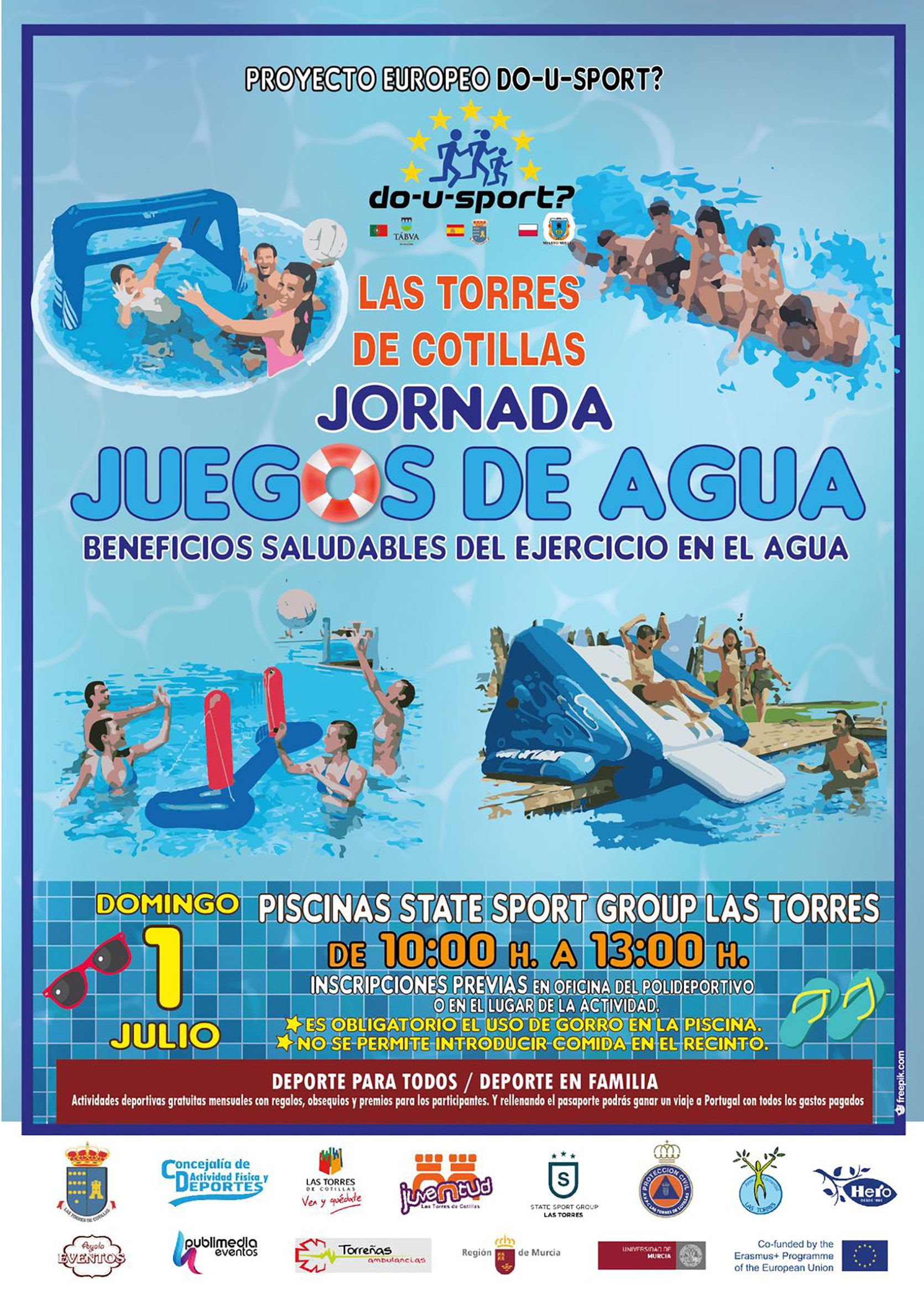 Las actividades deportivas del proyecto europeo 'Do-U-Sport' llegan a su fin en Las Torres de Cotillas. La duodécima propuesta de este programa será una jornada de juegos de agua que tendrá lugar mañana domingo 1 de julio de 10 a 13 horas en las piscinas del ‘State Sport Group Las Torres’. “Será una propuesta para mostrar los beneficios saludables del ejercicio en el agua y volverá a contar con asistencia gratuita”, explica el concejal de Actividad Física y Deportes, Ginés Pérez, cuya área coordina de nuevo esta actividad. Las inscripciones se pueden formalizar en las oficinas del polideportivo municipal o en el lugar de la actividad el mismo día, en una jornada en la que será obligatorio el uso de gorro.