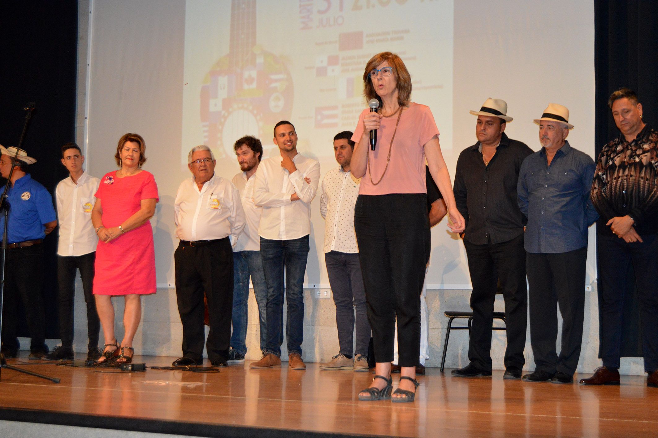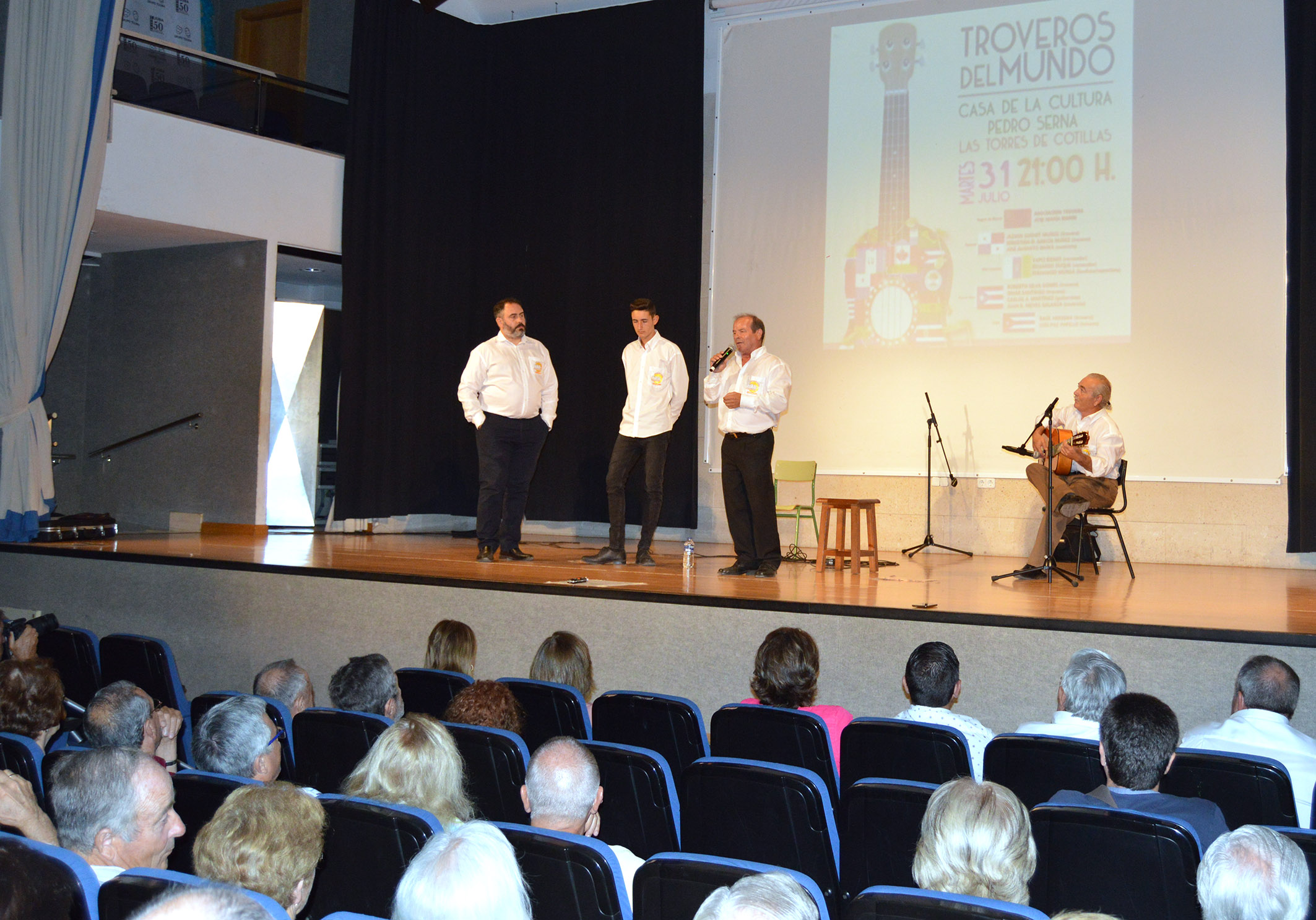 Una gran fiesta internacional del trovo de habla hispana. De eso disfrutaron en la noche de ayer martes 31 de julio los asistentes en la Casa de la Cultura ‘Pedro Serna’ de Las Torres de Cotillas al encuentro ‘Troveros del Mundo’. Una cita organizada por la asociación trovera ‘José María Marín’, en colaboración con el Ayuntamiento local, que contó con una rica participación. De Panamá vinieron los troveros Jazmín Sushet y Sebastián D. García, así como el cuatrista José Augusto Broce; de Puerto Rico los troveros Roberto Silva y Omar Santiago, el guitarrista Carlos A. Martínez y el cuatrista Juan R. Nieves; y de Cuba los troveros Raúl Herrera y Luis Paz.