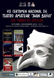 Las obras a concurso, que tendrán una entrada de 3 euros y se representarán a las 21 horas, serán las siguientes: el 6 de octubre la compañía ‘Expresando’ (Madrid) pondrá en escena ‘Tartufo’; el 13 de octubre ‘Maru-JASP’ (Alcalá de Henares) representará ‘Si algo puede suceder, aunque parezca improbable, acaba sucediendo de manera inevitable’; el 20 de octubre la ’Cía. Teatro en Construcción’ (Elche) llevará al escenario ‘Huanita’; y cerrará ’Almagra Teatro (Mula) con la representación de ‘Baldosas’ el 27 de octubre.