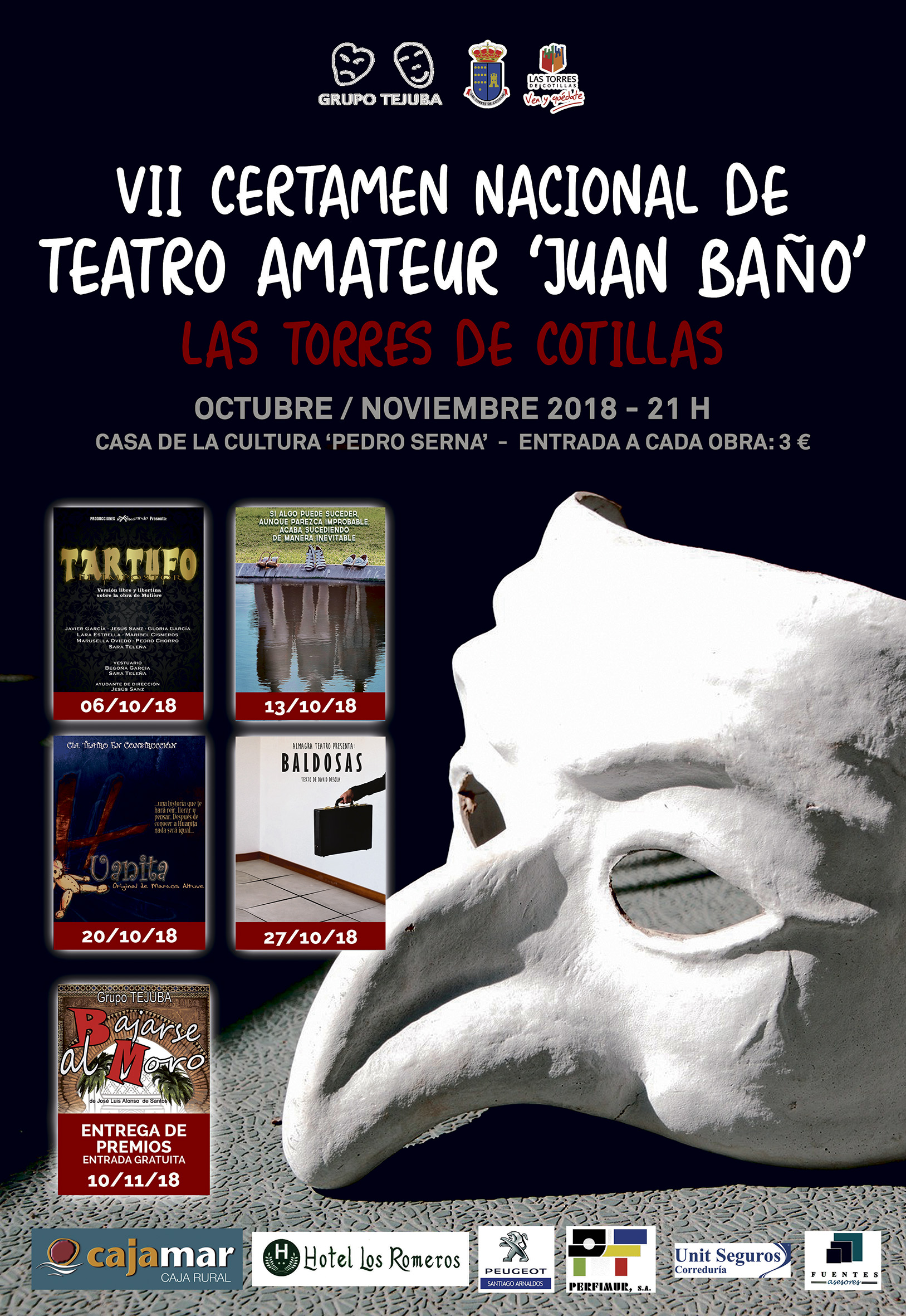 La clausura de este concurso teatral para grupos aficionados de toda España tendrá lugar el sábado 10 de noviembre en una velada con entrada gratuita en la que se entregarán los premios a los mejores. “Además, nuestro ‘Tejuba’ representará la obra ‘Bajarse al moro’ como colofón artístico al certamen”, señala Cabrera.