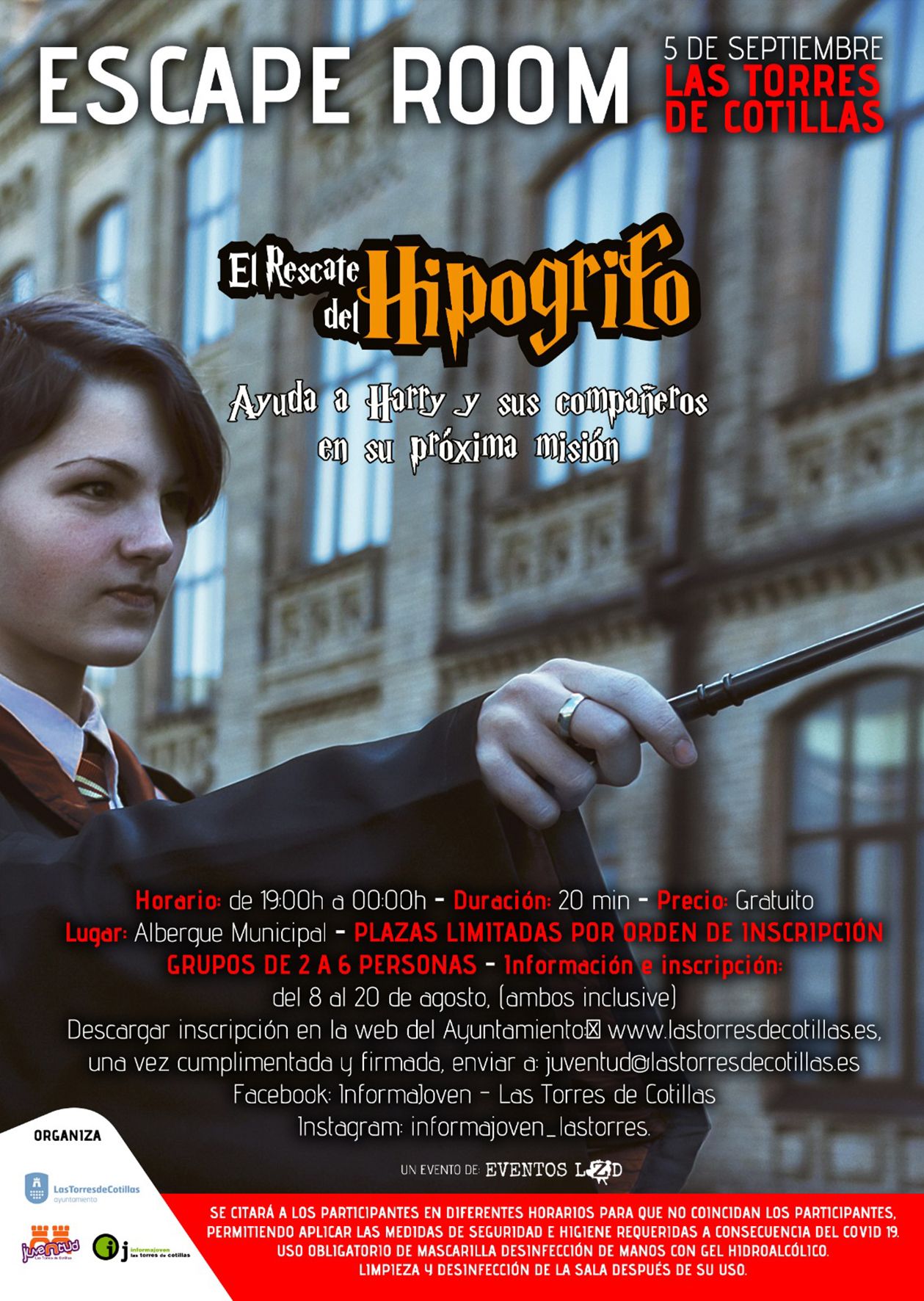 La Concejalía de Juventud de Las Torres de Cotillas propone una interesante y divertida actividad para el próximo sábado 5 de septiembre (19 horas): un escape room que, con el título “El rescate del hipogrifo”, está basado en las populares historias literarias del mago Harry Potter. Será en las instalaciones del Albergue Municipal, la asistencia será gratuita con plazas limitadas y podrán participar grupos de 2 a 6 personas en las sesiones de 20 minutos cada una, tras las que se desinfectarán el espacio y los objetos del juego.