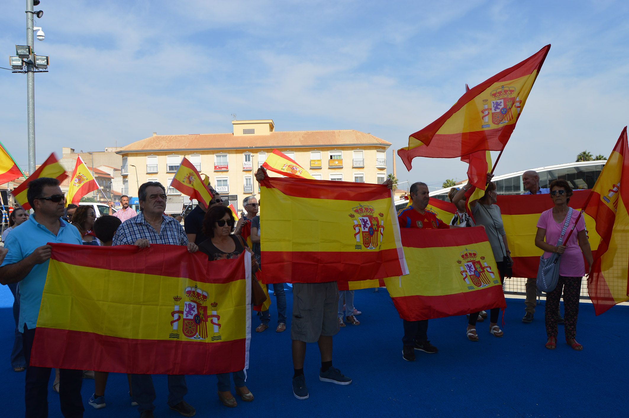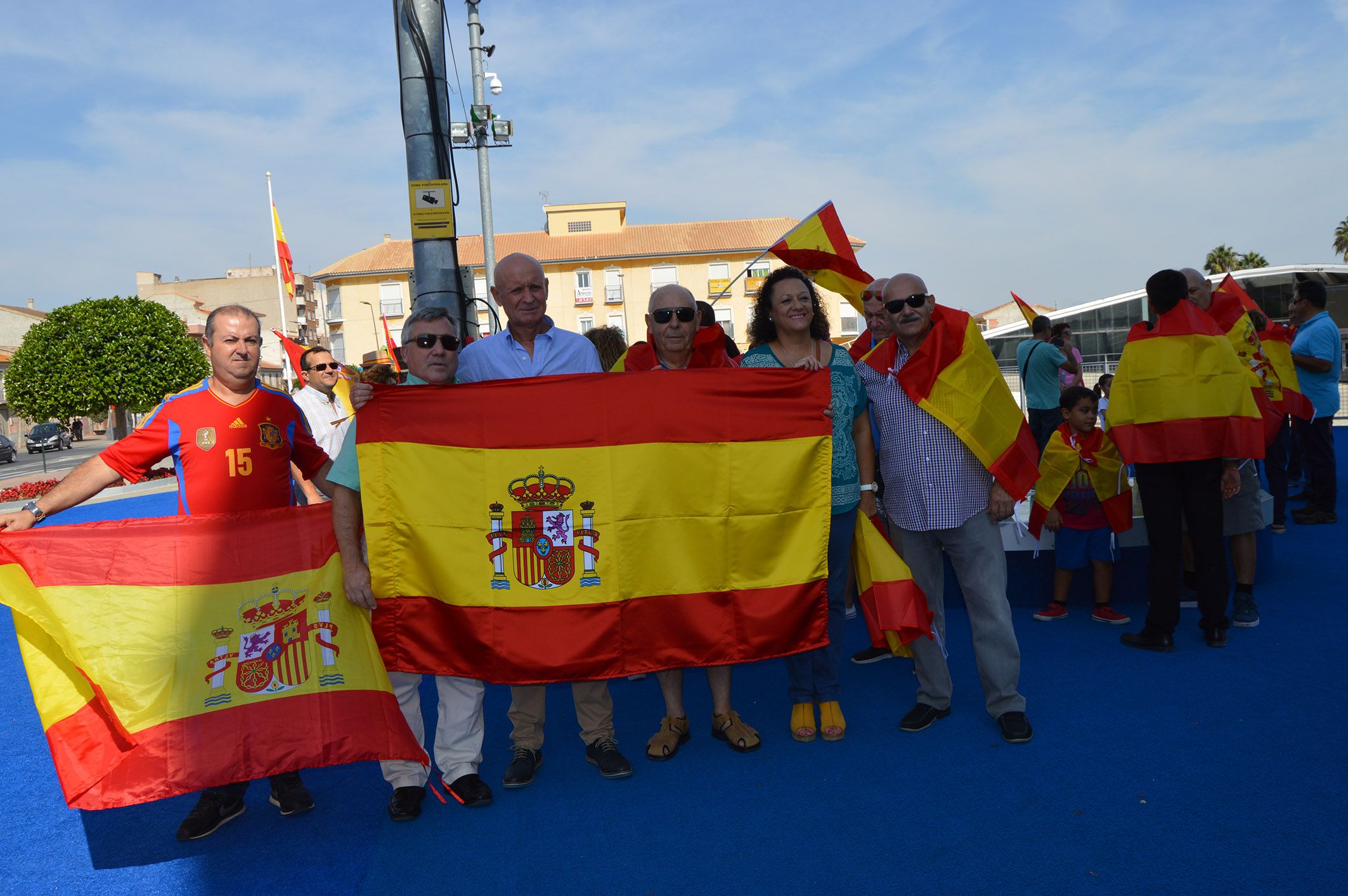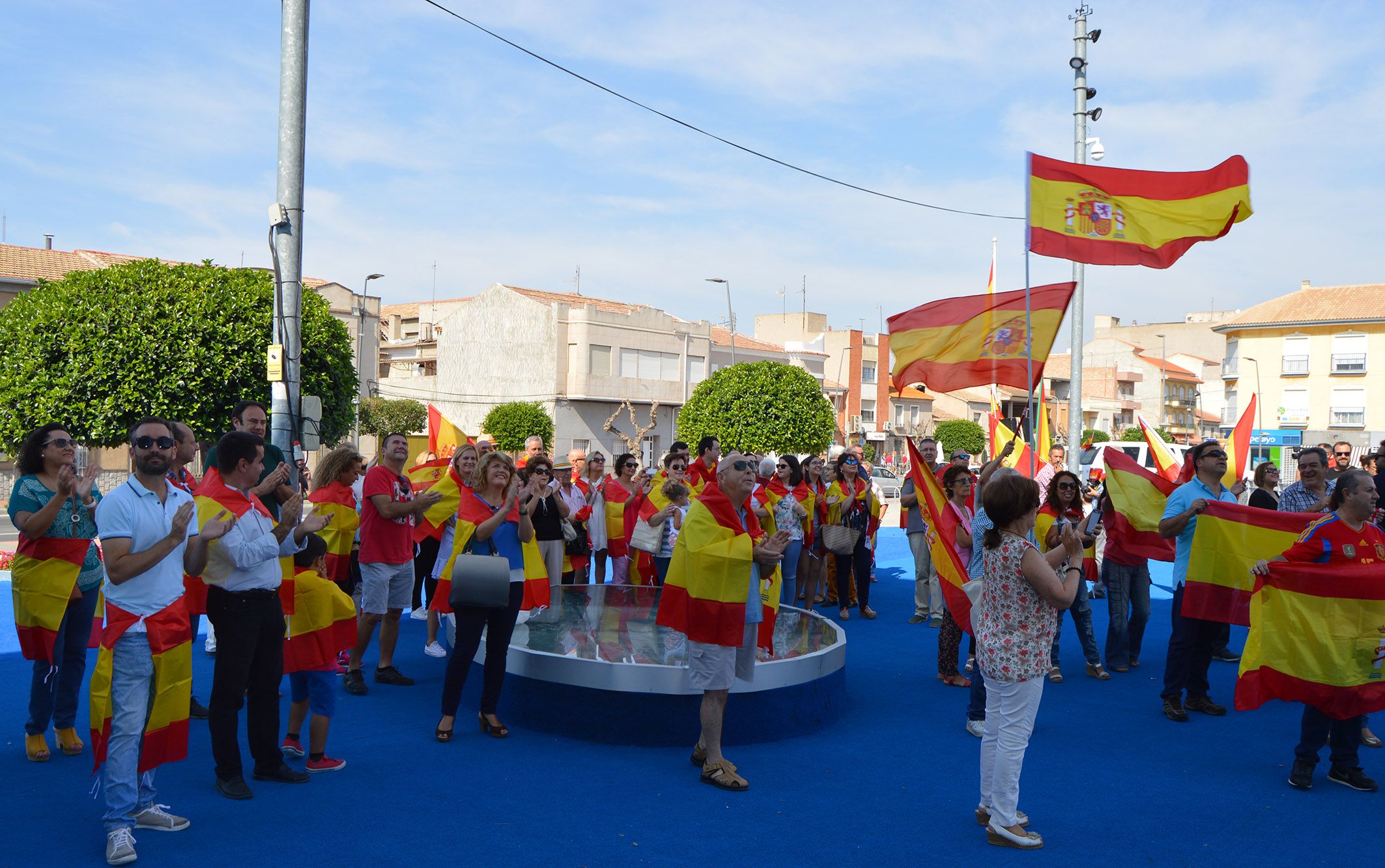 El municipio de Las Torres de Cotillas ha celebrado en la mañana de hoy sábado 30 de septiembre una concentración en defensa de la unidad de España, organizada por el Ayuntamiento en la plaza Adolfo Suárez. Al son del himno nacional durante este acto se ha desplegado una bandera gigante en la fachada del Consistorio, ante la atenta mirada de una numerosa representación de vecinos y vecinas que han acudido portando sus propios símbolos nacionales (banderas, camisetas, etc.).