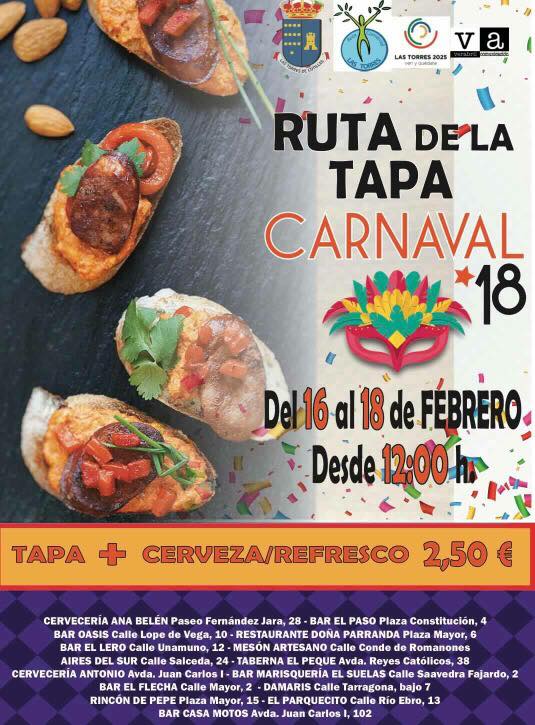 15 establecimientos hosteleros participan entre los próximos 16 y 18 de febrero en la ‘Ruta de la Tapa del Carnaval’ de Las Torres de Cotillas. Los clientes podrán disfrutar, desde las 12 horas hasta la hora de cierre de los bares, de tapa más cerveza o refresco por 2’50 euros. “Con esta ruta podemos disfrutar de esta magnífica oferta tanto al mediodía como por la noche”, señala la concejal de Festejos, Amalia Pérez.