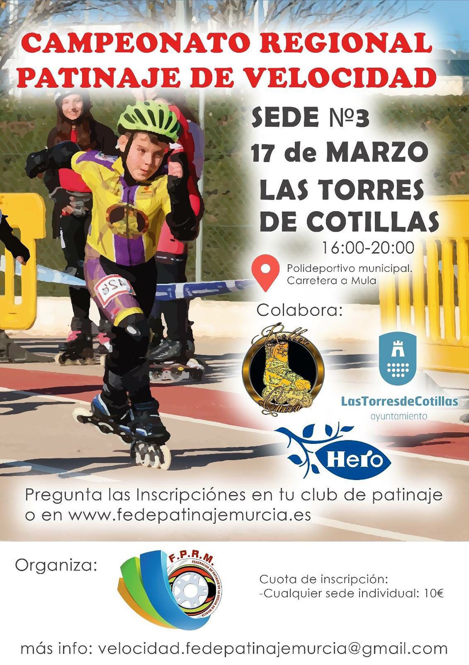 La Federación de Patinaje de la Región de Murcia celebrará mañana sábado 17 de marzo (16 horas) la prueba de la sede número 3 del campeonato regional de patinaje de velocidad en el polideportivo municipal de Las Torres de Cotillas. El evento, en el que colaboran la Concejalía de Actividad Física y Deportes y el club torreño ‘Roller Queen’, podrán participar aquellos patinadores con licencia federativa en vigor.