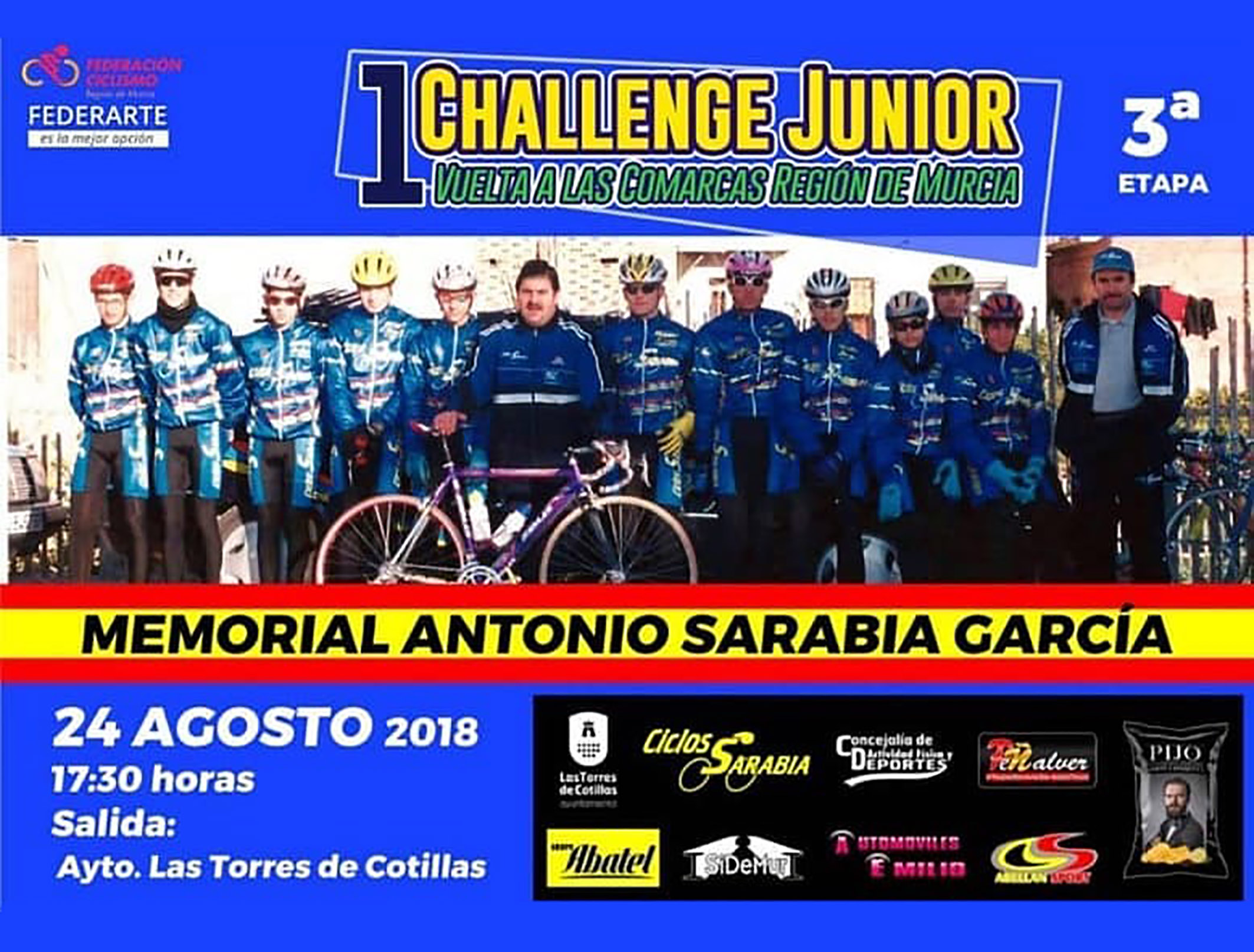 La tercera etapa de campeonato regional junior de ciclismo concluirá en Las Torres de Cotillas. Será el viernes 24 de agosto, coincidiendo con el comienzo de las fiestas patronales del municipio, en una jornada en la que los corredores deberán cubrir una distancia de 92 kilómetros y con la que concluirá este campeonato. “Será un recorrido urbano y durante la jornada también se disputará el ‘I Memorial Antonio Sarabia García’, prueba con la que se homenajeará a esta persona tan querida en nuestro municipio y apreciada por la familia ciclista de nuestra Región”, explica el concejal de Actividad Física y Deportes, Ginés Pérez, que señala que ésta es una prueba oficial de carácter federado puntuable para el ranking nacional.