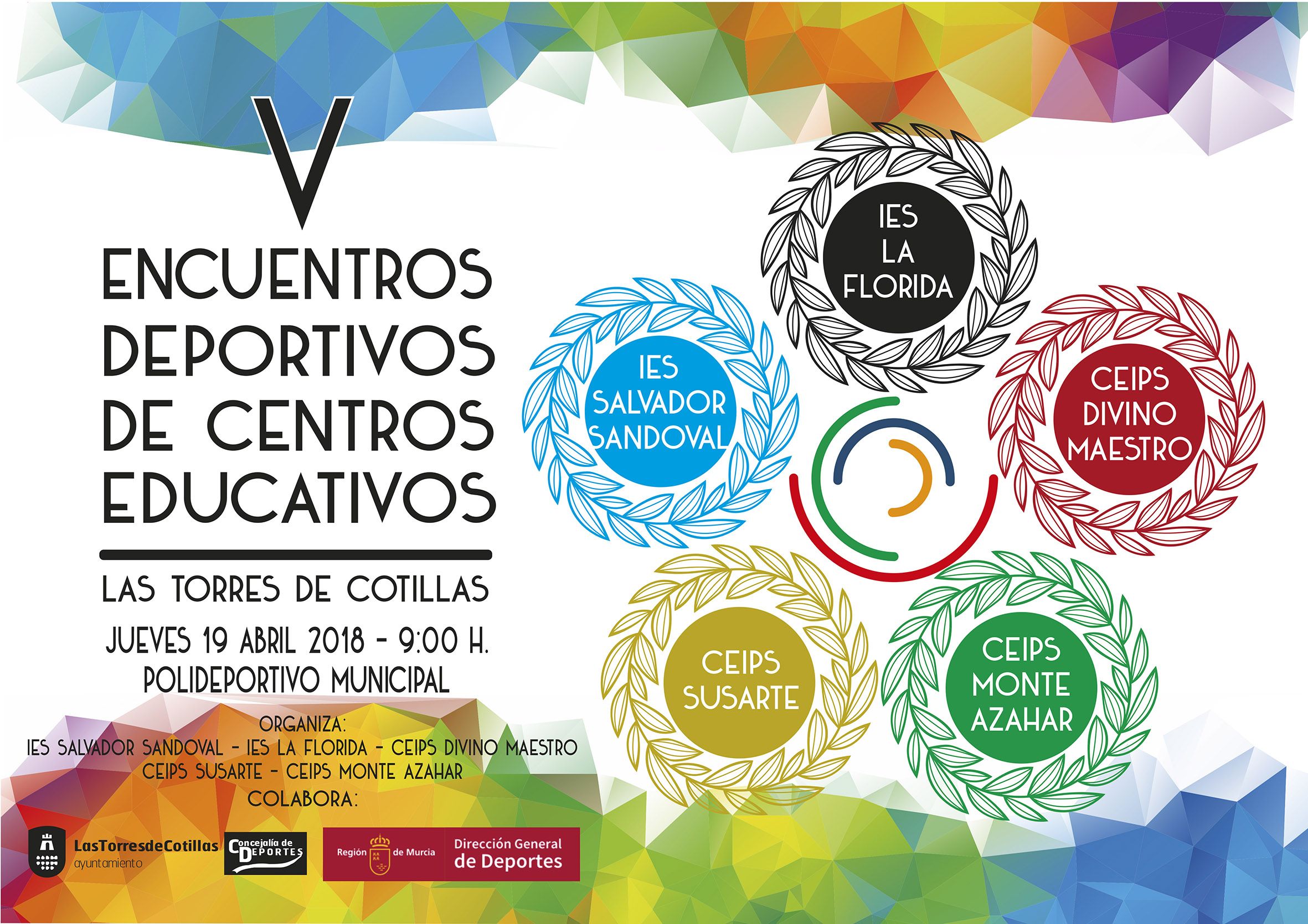 Los ‘Encuentros Deportivos Escolares’ de Las Torres de Cotillas celebran mañana jueves 19 de abril (9 horas) su quinta edición, con la participación de cinco centros docentes del municipio. “Serán cerca de 500 alumnos de Secundaria de los IES ‘La Florida’ y ‘Salvador Sandoval’, y de los colegios ‘Susarte’, ‘Divino Maestro’ y ‘Monte Azahar’ los que participen en este evento que tendrá lugar en el polideportivo municipal y que será una gran mañana de convivencia deportiva”, explica la alcaldesa Isabel María Zapata.
