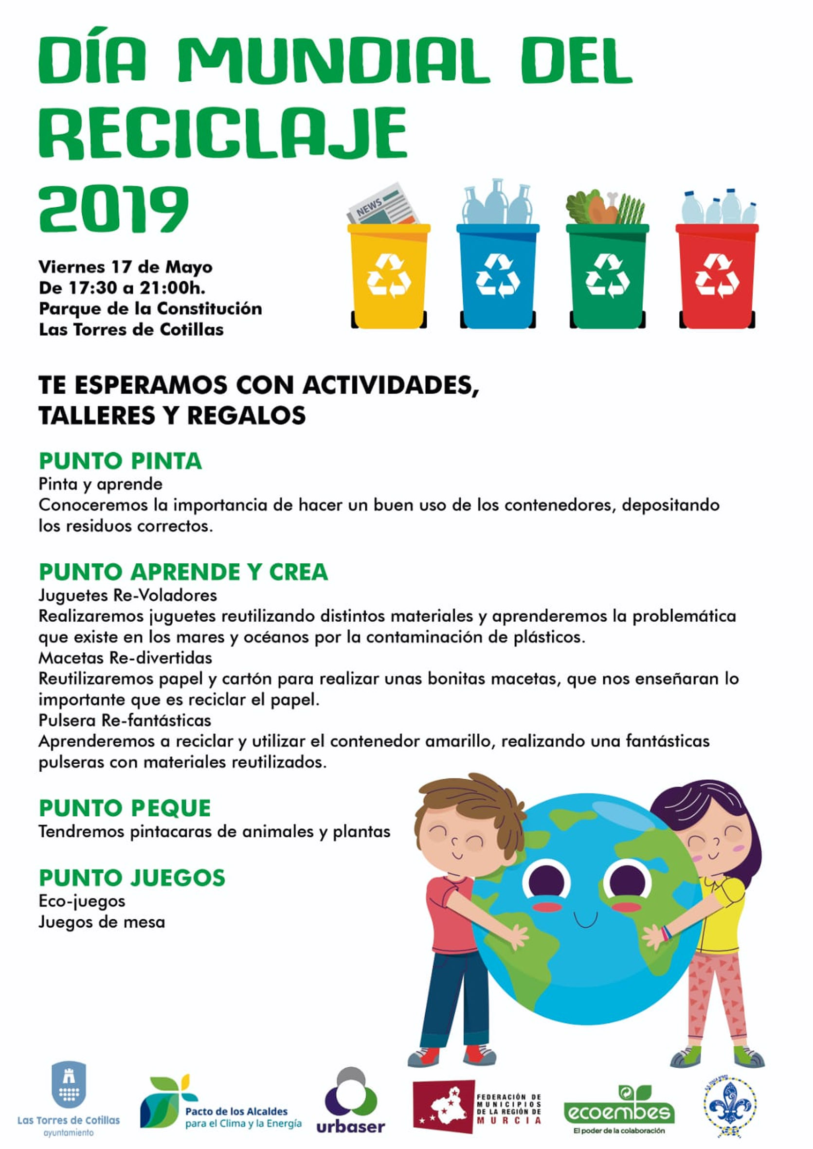 16/05/19 – Mañana viernes 17 de mayo (17’30 horas) Las Torres de Cotillas celebrará en el parque de la Constitución el día mundial del reciclaje. Lo hará con una propuesta con asistencia gratuita desarrollada por la Concejalía de Medio Ambiente, enfocada principalmente a la concienciación de la población infantil, donde no faltarán actividades, talleres y regalos.