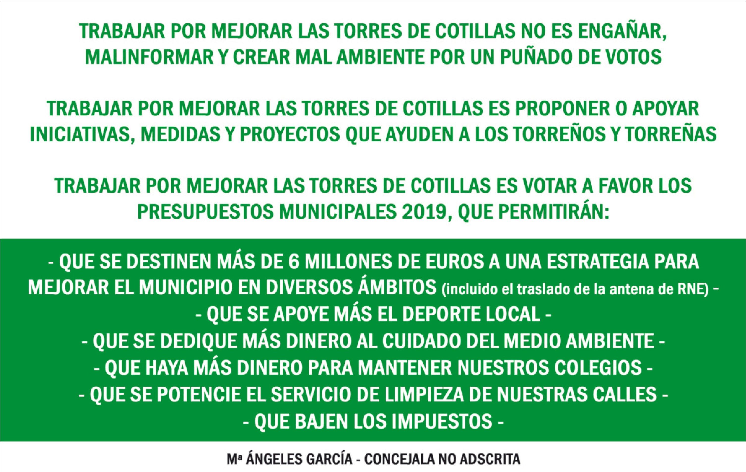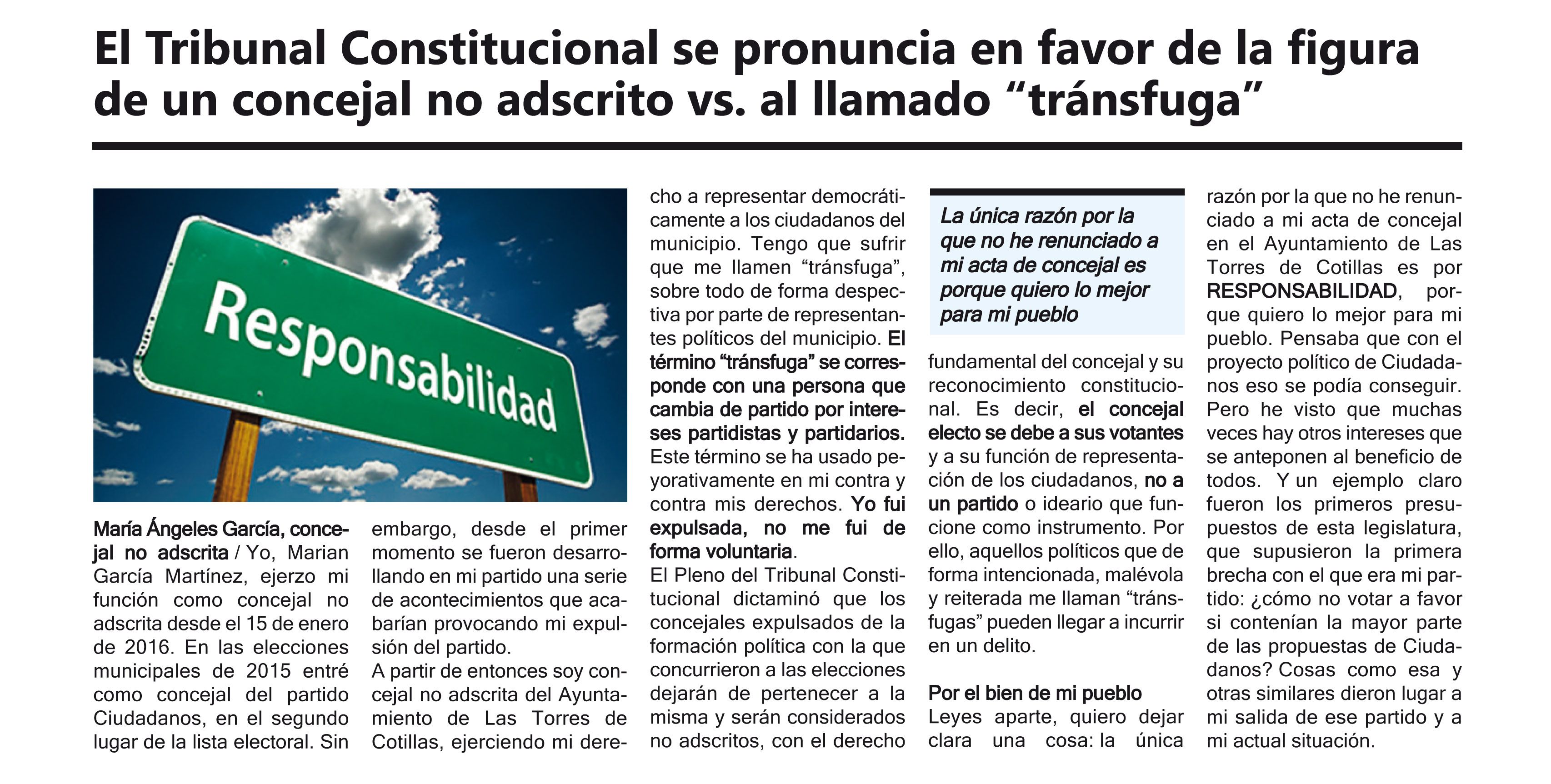 Opinión de la concejala no adscrita en el boletín municipal Municipio Por TemasLas Torres de CotillasTransporte públicoTeléfono de InterésResultado EleccionesPlaneamiento UrbanísticoRutas del Municipio · Marzo 2018 · Diciembre 2018