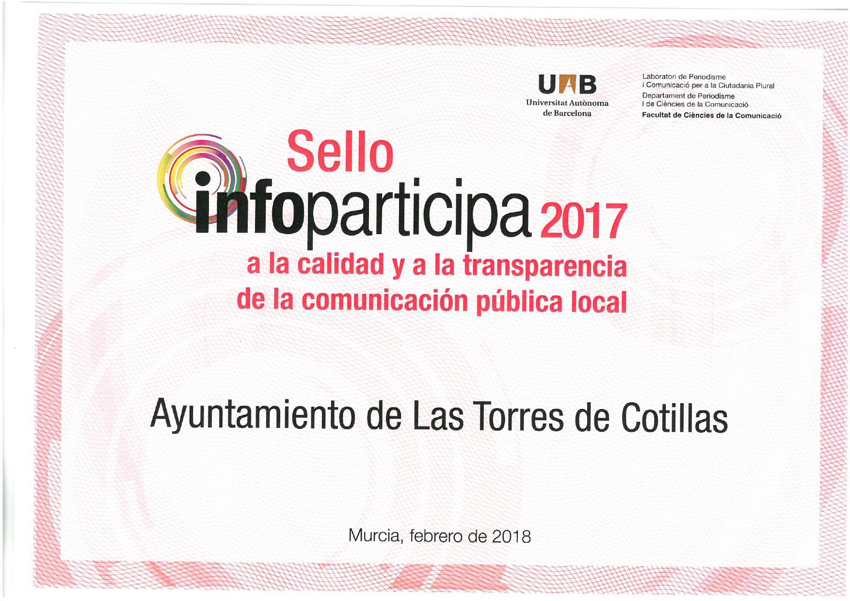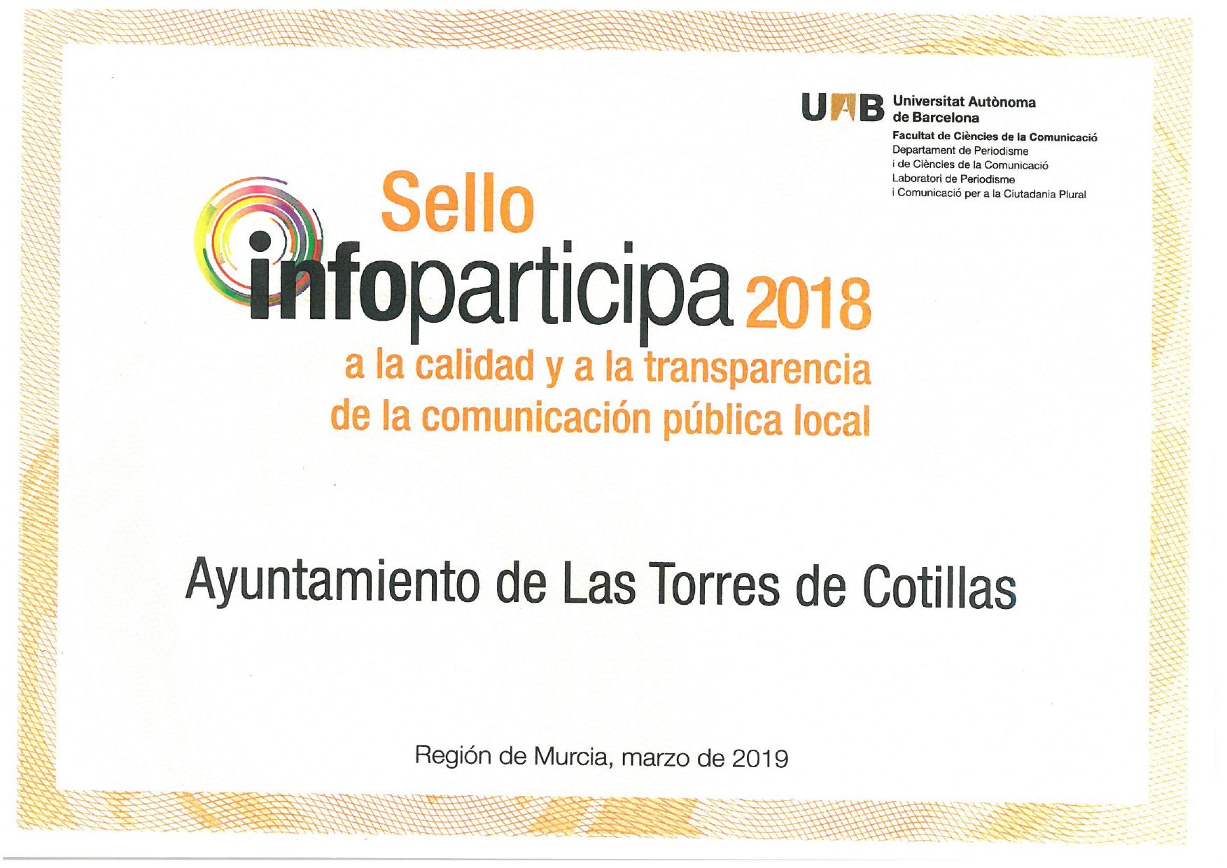 El Laboratorio de Periodismo y Comunicación para la Ciudadanía Plural (LPCCP) de la Universidad Autónoma de Barcelona (UAB), en colaboración con la Facultad de Comunicación de la Universidad de Murcia (UMU), desde hace varios años evalúa la transparencia de las Paginas Web de los municipios de la Región de Murcia, y otorga el Sello Infoparticipa a aquellos ayuntamientos que superan determinado porcentaje de los parámetros para medir la calidad y la transparencia de la información pública local.
