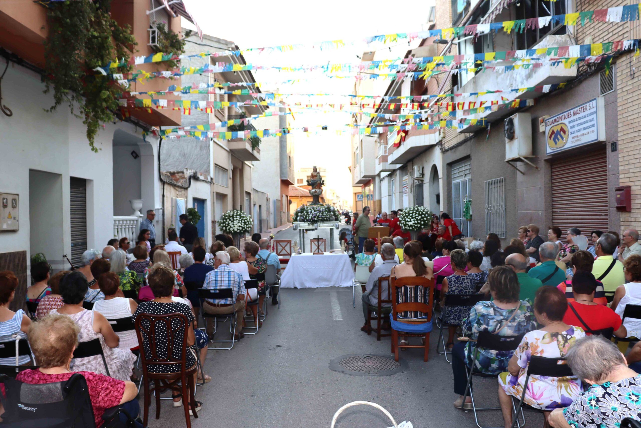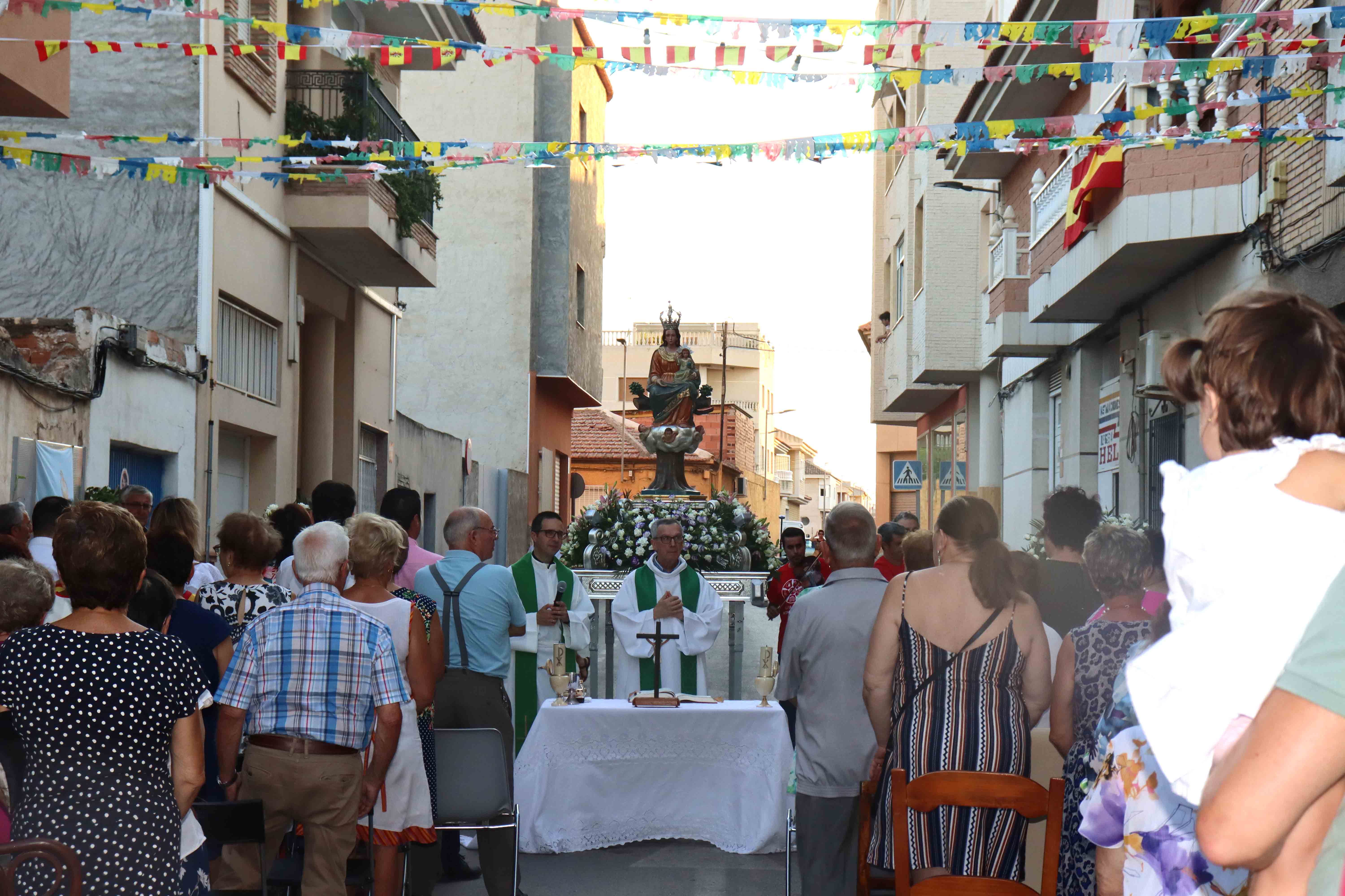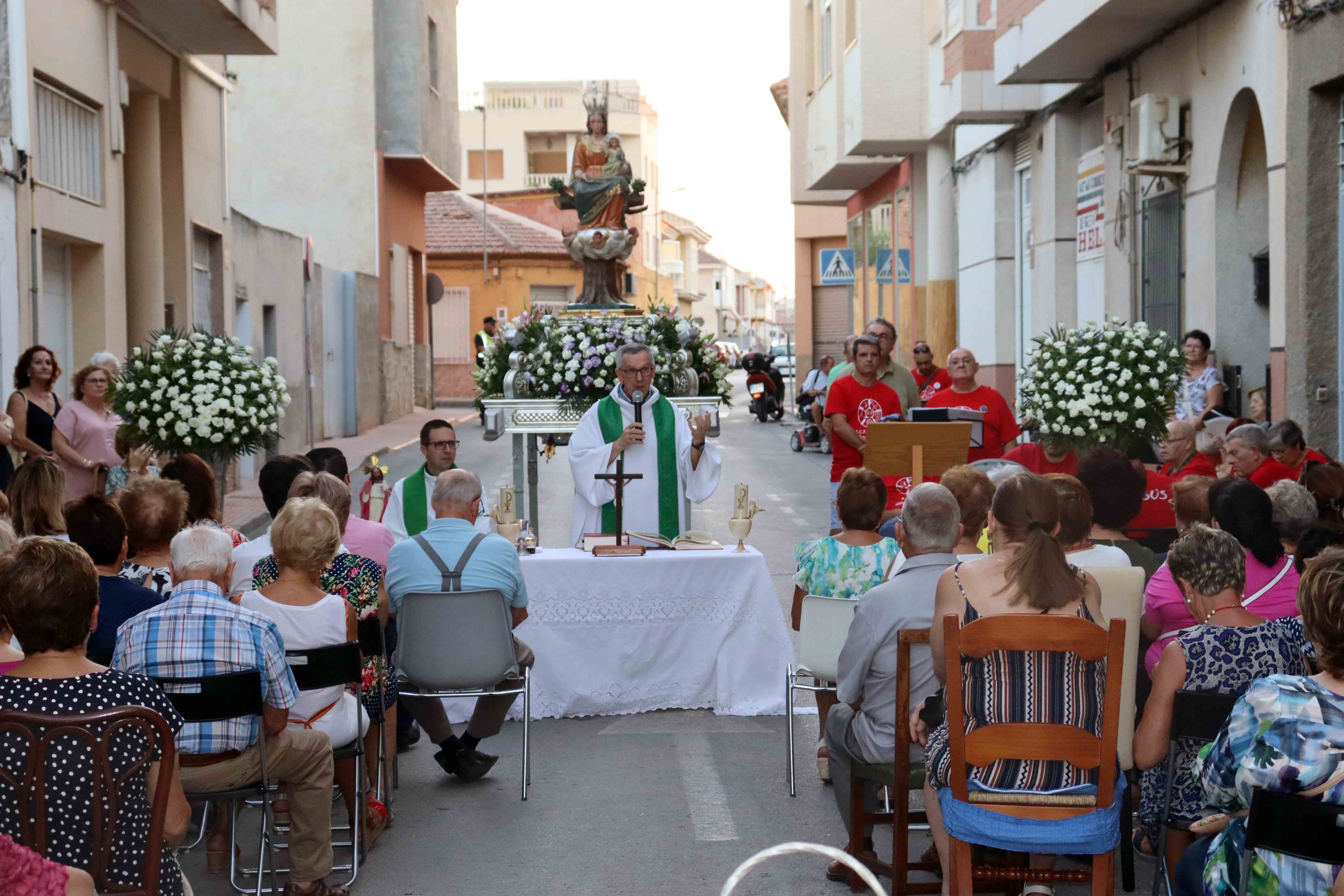 Celebración de la Santa Misa dentro del programa de actos que tienen lugar con motivo de las fiestas patronales en honor a la Virgen de la Salceda, con asistencia de numerosos vecinos de todas las edades y del alcalde, Pedro José Noguera, así como la primera teniente de alcalde, Isabel María Zapata, el pregonero de los festejos, Joaquín Conesa, diferentes miembros de la Corporación municipal y las Majas Mayores.