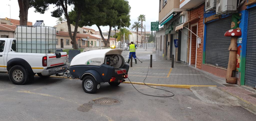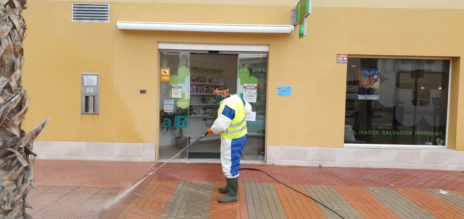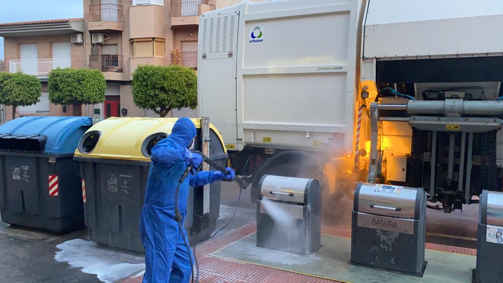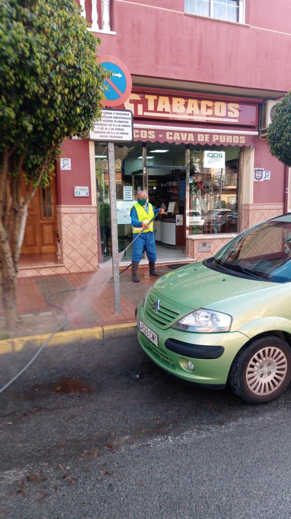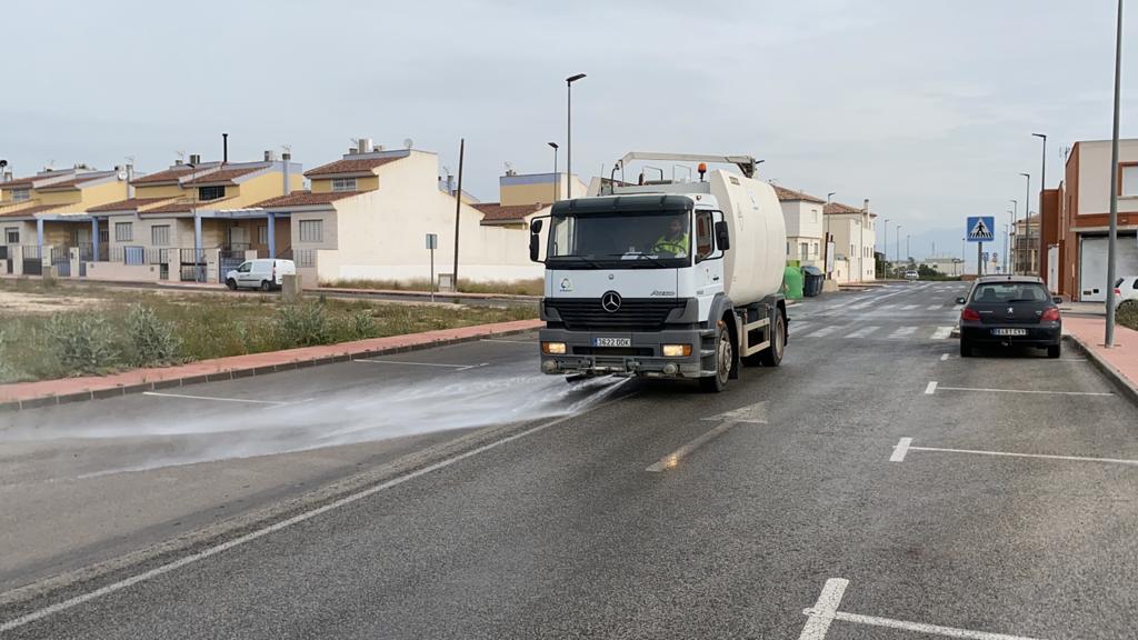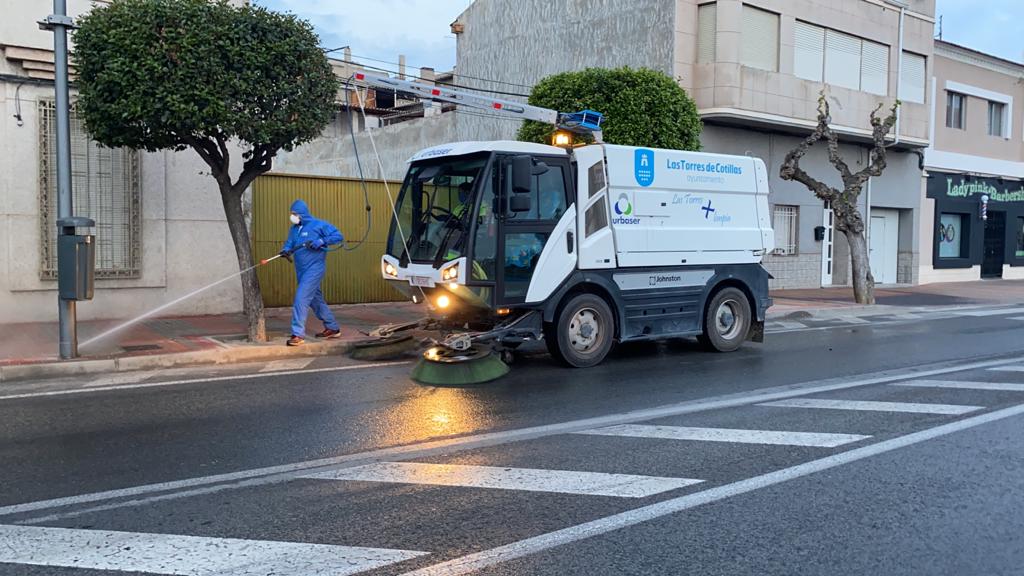 El Ayuntamiento de Las Torres de Cotillas intensifica las labores de limpieza y desinfección de diferentes viales del municipio, que corren a cargo de las empresas concesionarias de los servicios de recogida de residuos sólidos urbanos y limpieza viaria del municipio, y de mantenimiento de zonas verdes Con el objetivo de frenar la propagación del coronavirus, tratan diariamente zonas que pueden albergar una alta confluencia de vecinos y personal como farmacias, centros médicos, servicio de Urgencias, instalaciones de Policía Local y Protección Civil, supermercados y tiendas de alimentación, panaderías, marquesinas de autobús, semáforos con pulsador y demás mobiliario de la calle Mayor.