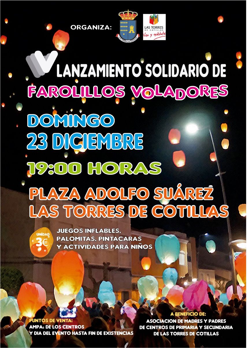 Mañana domingo 23 de diciembre (19 horas) se celebra en la plaza Adolfo Suárez de Las Torres de Cotillas la quinta edición de la suelta navideña de farolillos voladores del municipio. “Este año hemos decidido que las Asociaciones de Madres y Padres de Alumnos (AMPAs) del municipio sean las beneficiadas, que están siendo las encargadas de realizar íntegramente su venta”, explica la alcaldesa, Isabel María Zapata.
