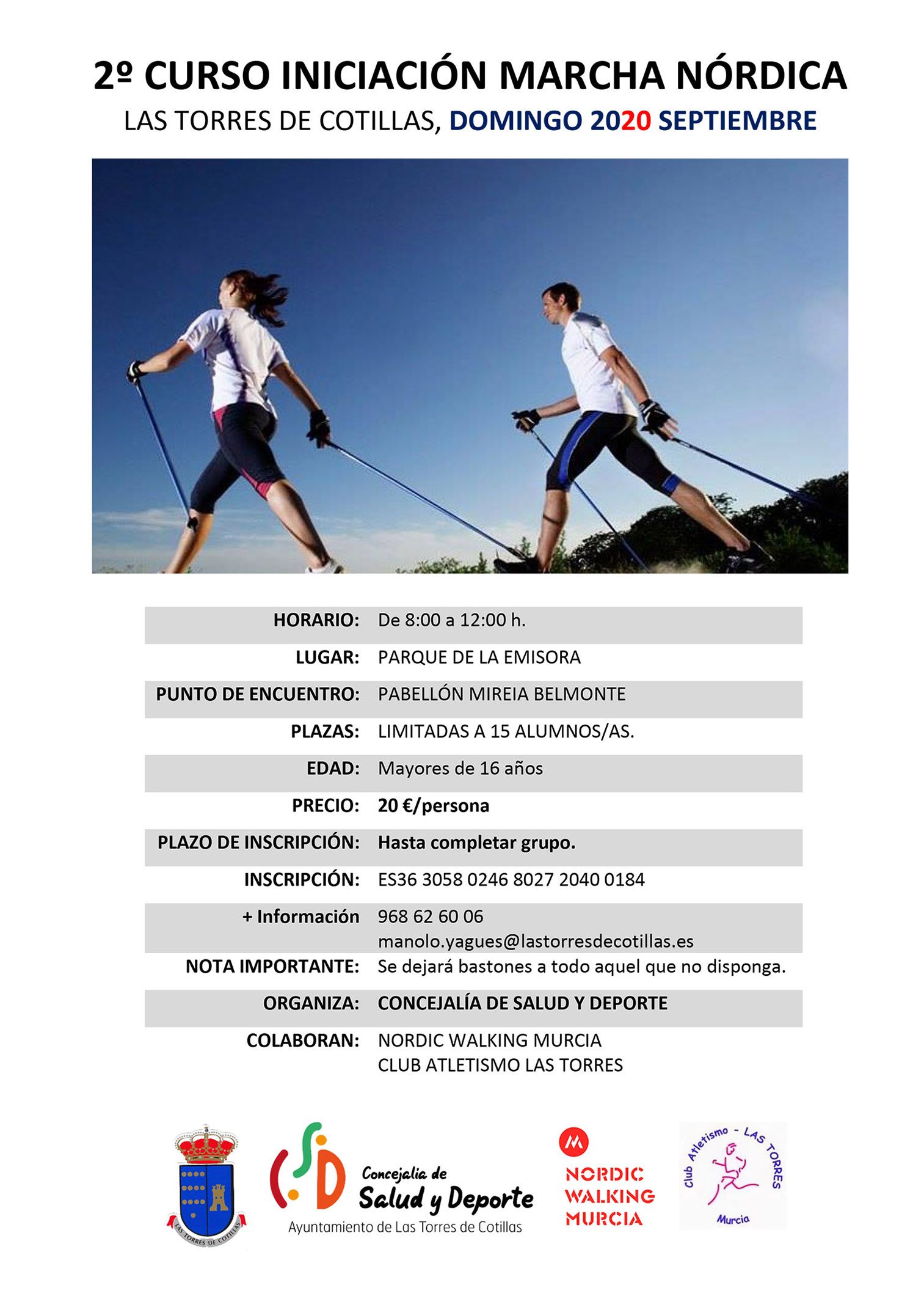 Todavía quedan plazas para el curso de iniciación a la marcha nórdica que este domingo 20 de septiembre (8 horas) celebra la Concejalía de Salud y Deportes de Las Torres de Cotillas, en el que contará con la colaboración del Nordic Walking Murcia y el club Atletismo Las Torres. “Tras la buena acogida del que realizamos el pasado 21 de junio, que agotó todas sus plazas, hemos decidido lanzar una nueva edición”, explica la concejala Verónica Morcillo De la Torre, que recalca que esta actividad al aire libre se regirá por un estricto protocolo de seguridad sanitaria.