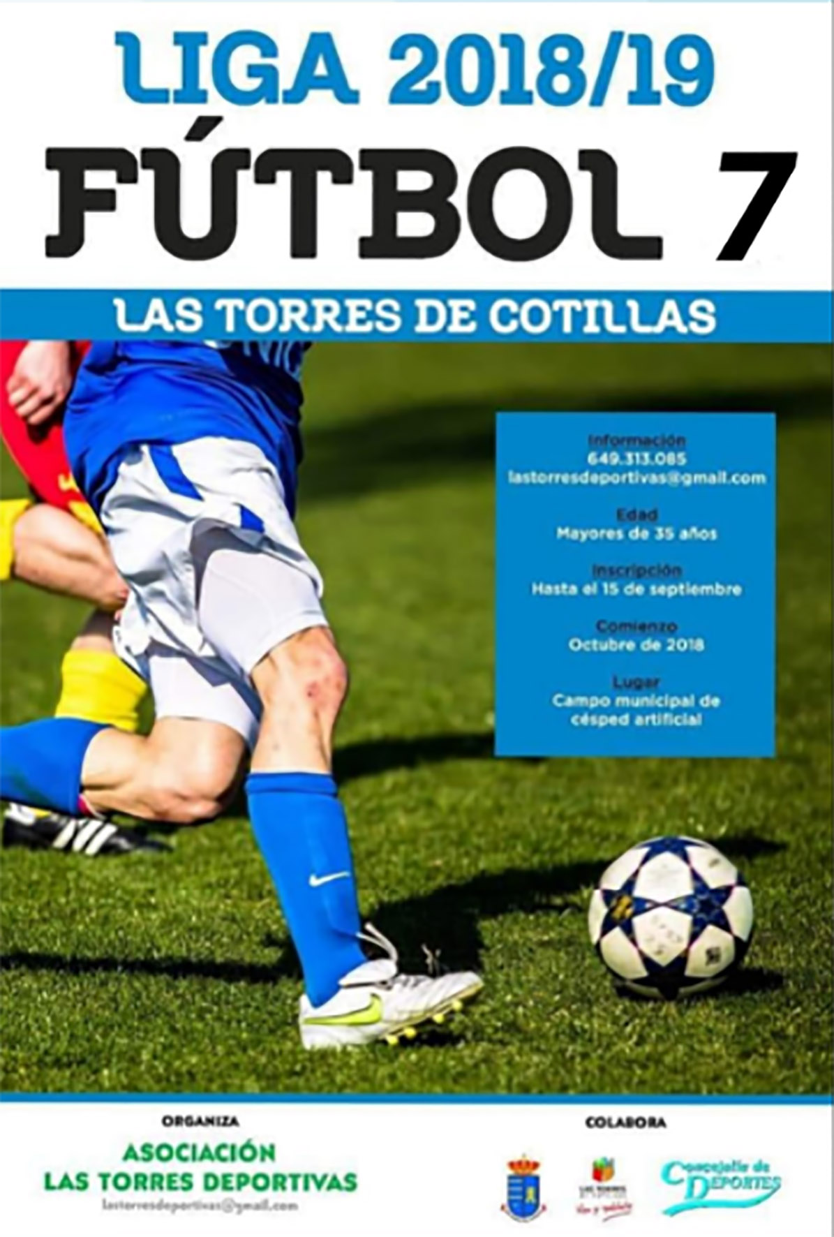 La liga 2018/19 de fútbol 7 para aficionados de Las Torres de Cotillas, que comienza el próximo mes de octubre, está a punto de cerrar su plazo de inscripción. Organizado una vez más por la ‘Asociación Las Torres Deportivas’ en colaboración con la Concejalía de Actividad Física y Deportes, este torneo se disputará nuevamente en el campo municipal ‘Onofre Fernández Verdú’ y admite solicitudes hasta el próximo 15 de septiembre.