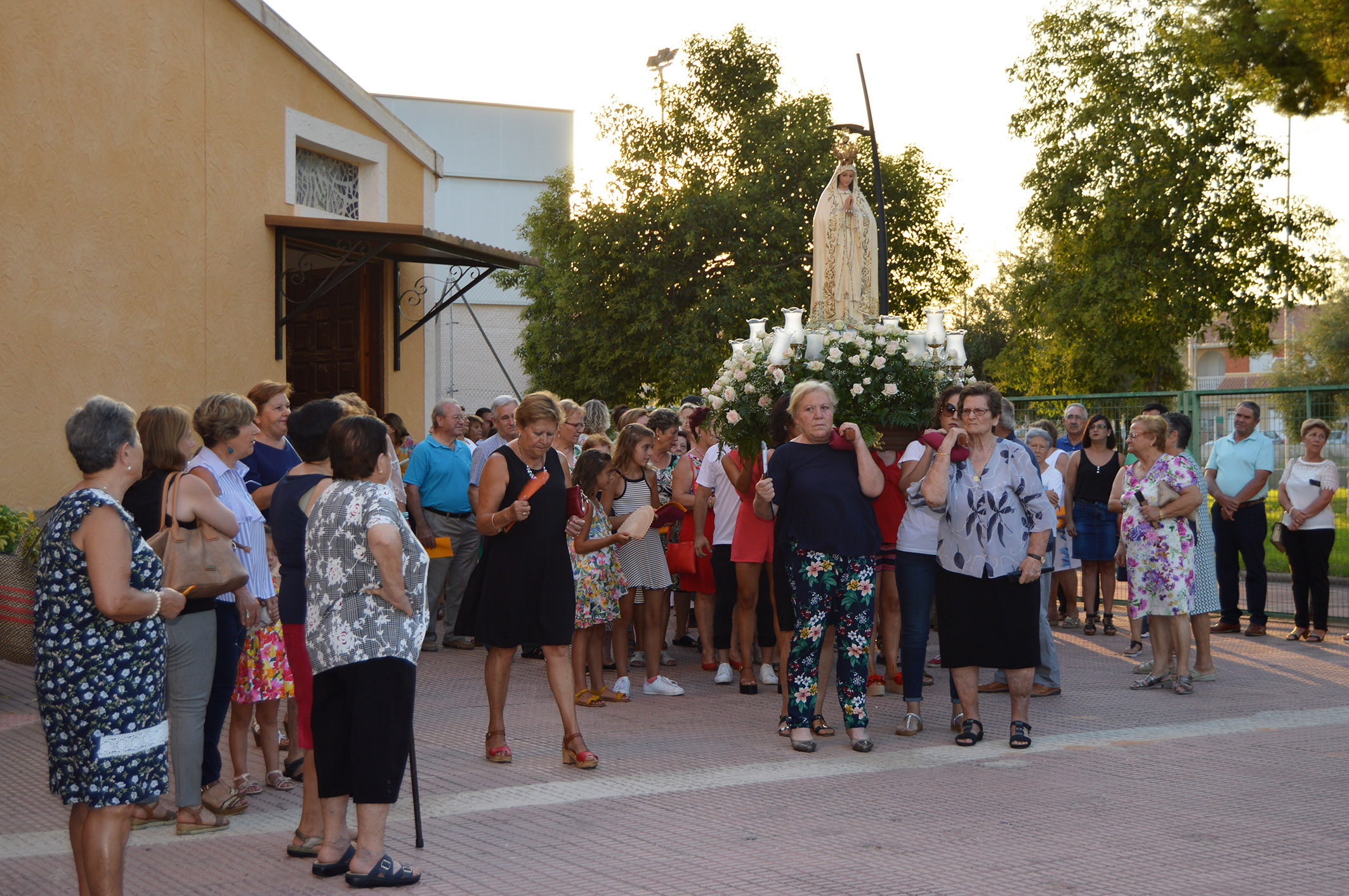 19/08/19 – El jueves 15 de agosto concluyeron las fiestas patronales del barrio de Los Pulpites de Las Torres de Cotillas, celebradas un año más en honor a Nuestra Señora de Fátima. La última jornada comenzó por la tarde con una misa en honor a la patrona en la parroquia de La Asunción, tras la que se celebró la procesión con la imagen de la virgen y un gran castillo de fuegos artificiales y una cena fría de convivencia como cierre.