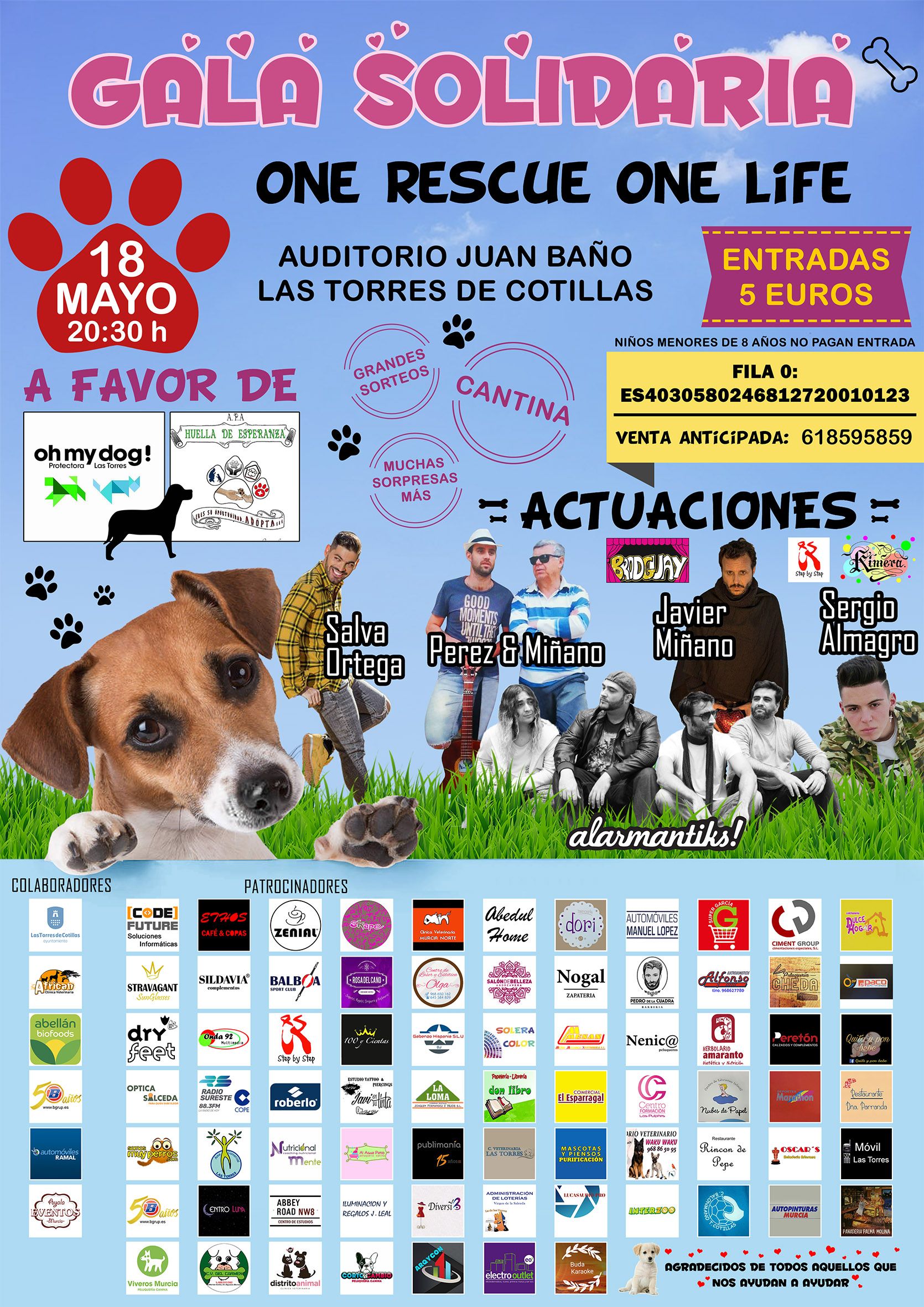 El auditorio municipal ‘Juan Baño’ de Las Torres de Cotillas acogerá mañana viernes 18 de mayo (20’30 horas) la gala solidaria ‘One rescue one life’, un evento solidario con la actuación de grandes artistas y academias de baile. “El objetivo de la velada es recoger fondos en favor de los perros sin hogar que las protectoras de animales ‘Oh my dog!’ y ‘Huella de esperanza’ se encargan de rescatar y cuidar”, explica la alcaldesa Isabel María Zapata, que adelanta que “además habrá sorteos y muchas sorpresas”.