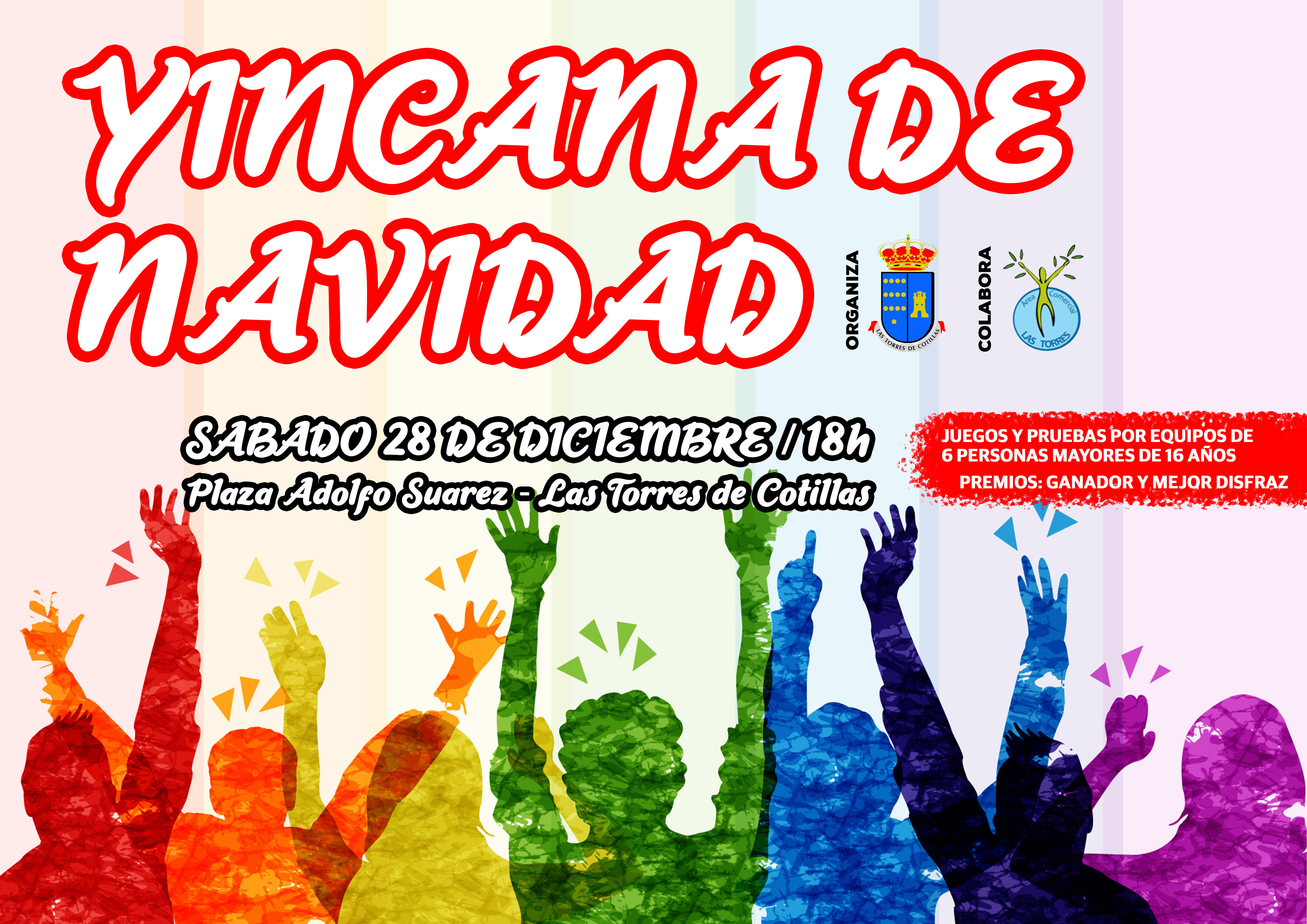 27/12/19 – La Concejalía de Festejos de Las Torres de Cotillas propone para mañana sábado 28 de diciembre (18 horas) una divertida yincana de Navidad, ideada para mayores de 16 años. Será en la Plaza Adolfo Suárez para equipos compuestos al menos por seis miembros que, además, deben acudir caracterizados de una temática relacionada con la Navidad o con esta época festera. “Sus disfraces deben permitirles realizar todas las pruebas, que consistirán en juegos de habilidad, fuerza, destreza, compañerismo y trabajo en equipo, y les serán explicadas el mismo día del evento para que ningún equipo parta con ventaja”, explica el concejal Francisco José Caravaca Bravo.
