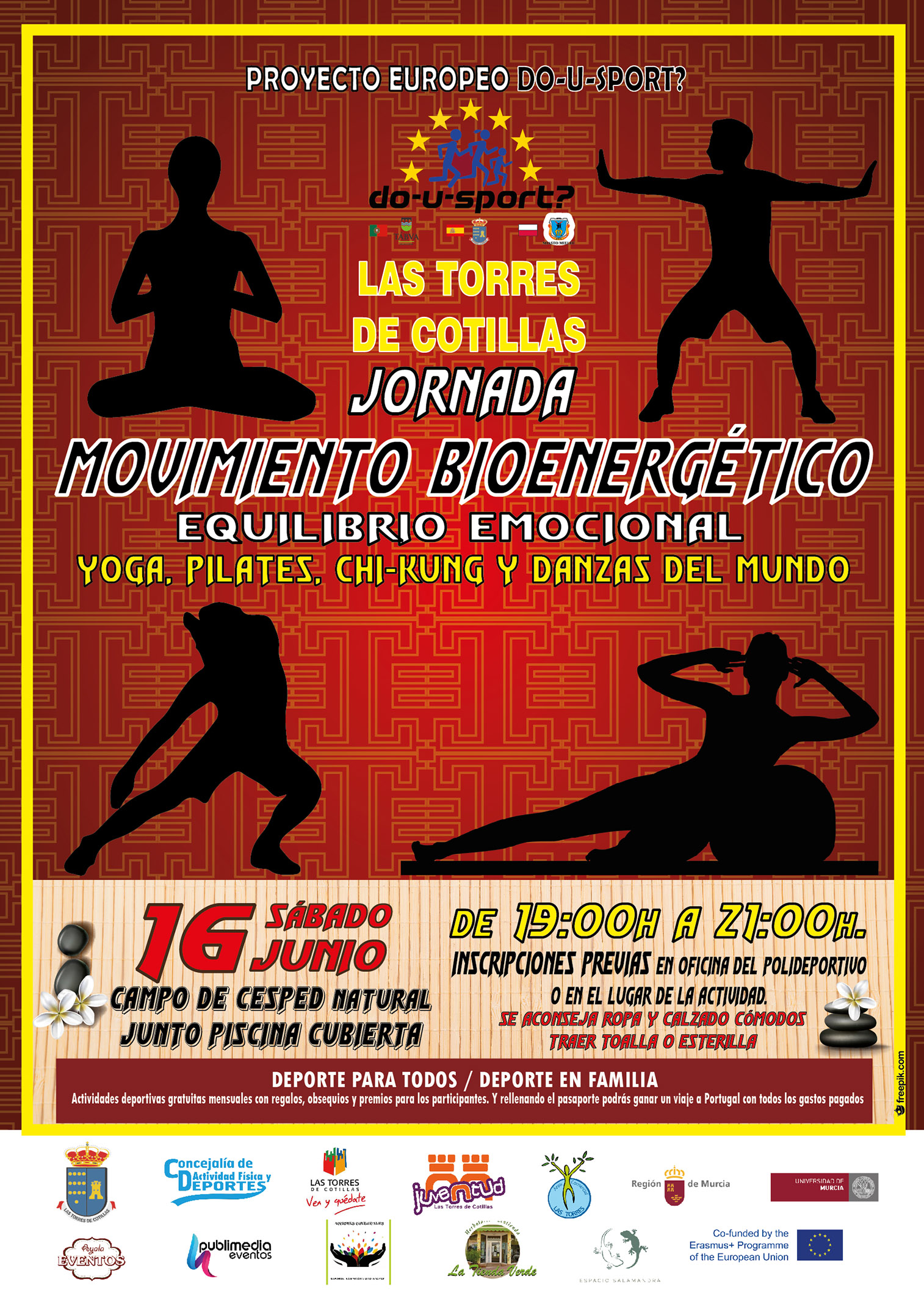 Una jornada sobre movimiento bioenergético es la siguiente cita del proyecto europeo 'Do-U-Sport' en Las Torres de Cotillas. Será mañana sábado 16 de junio (19 horas) en el campo municipal de césped natural y como todas las propuestas anteriores contará con asistencia gratuita. “Los asistentes podrán participar en actividades de yoga, pilates, chi-kung o danzas del mundo, y deberán llevar ropa y calzado cómodo y esterilla o toalla”, informa la alcaldesa, Isabel María Zapata.