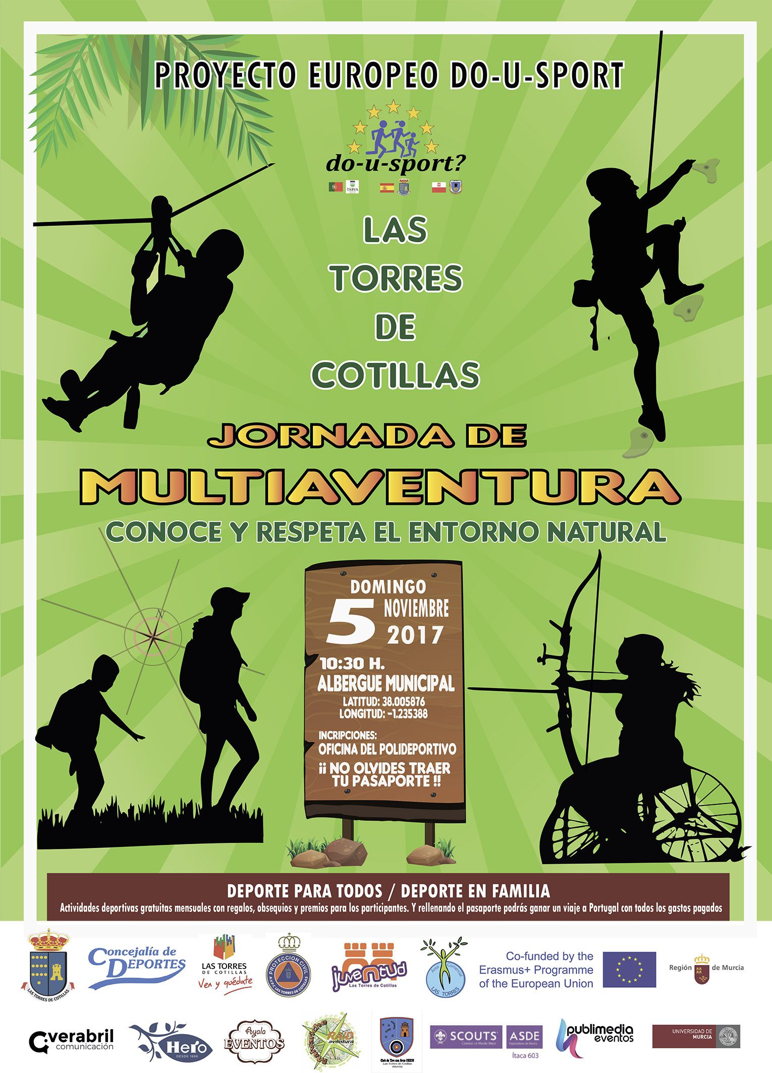 Mañana domingo 5 de noviembre (10’30 horas) se celebra en Las Torres de Cotillas la cuarta actividad del proyecto europeo ‘Do-U-Sport’, una jornada de multiaventura que tendrá lugar horas en el Albergue Municipal. Organizada por la Concejalía de Juventud, Actividad Física y Deportes, en este evento colaboran el club de tiro con arco ‘Orión’, el grupo de scouts ‘Ítaca’ y el club de aventura ‘Malvariche’. “Durante la jornada se practicarán juegos y dinámicas de scout, pruebas de orientación, tiro con arco, tirolina, puente-mono, pintacaras y manualidades, entre otras actividades de aventura en plena naturaleza”, explica el concejal del área, Ginés Pérez.