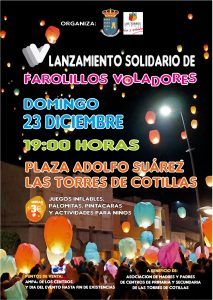 Ya se han puesto a la venta los tickets para la suelta navideña de farolillos voladores de Las Torres de Cotillas, que tendrá lugar el próximo domingo 23 de diciembre (19 horas) en la plaza Adolfo Suárez. Este año su recaudación será a beneficio de las Asociaciones de Madres y Padres de Alumnos (AMPAs) de los colegios de Infantil y Primaria del municipio, además de los dos institutos de Secundaria. “Éste es un evento que cumple su quinta edición y este año hemos decidido que todas las AMPAs sean las beneficiadas, que serán las encargadas de realizar íntegramente su venta”, explica la alcaldesa, Isabel María Zapata.